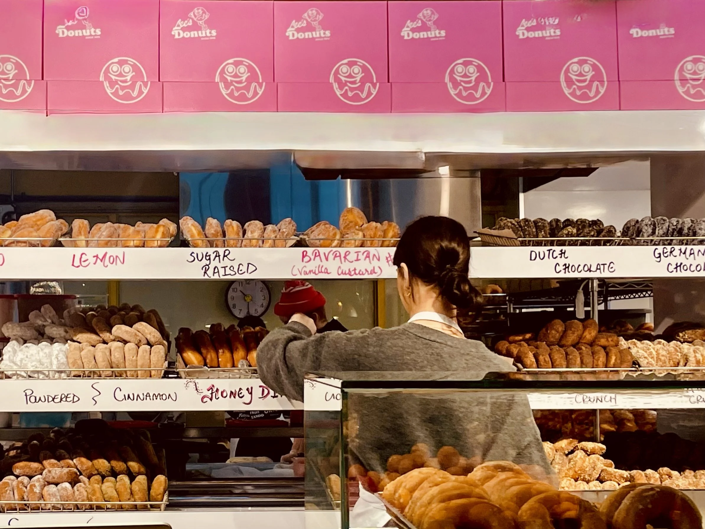 A bakery display with various donuts in boxes and shelves, including lemon, sugar raised, Bavarian vanilla custard, Dutch chocolate, German chocolate, and cinnamon honey donuts, with two women shopping in the background.