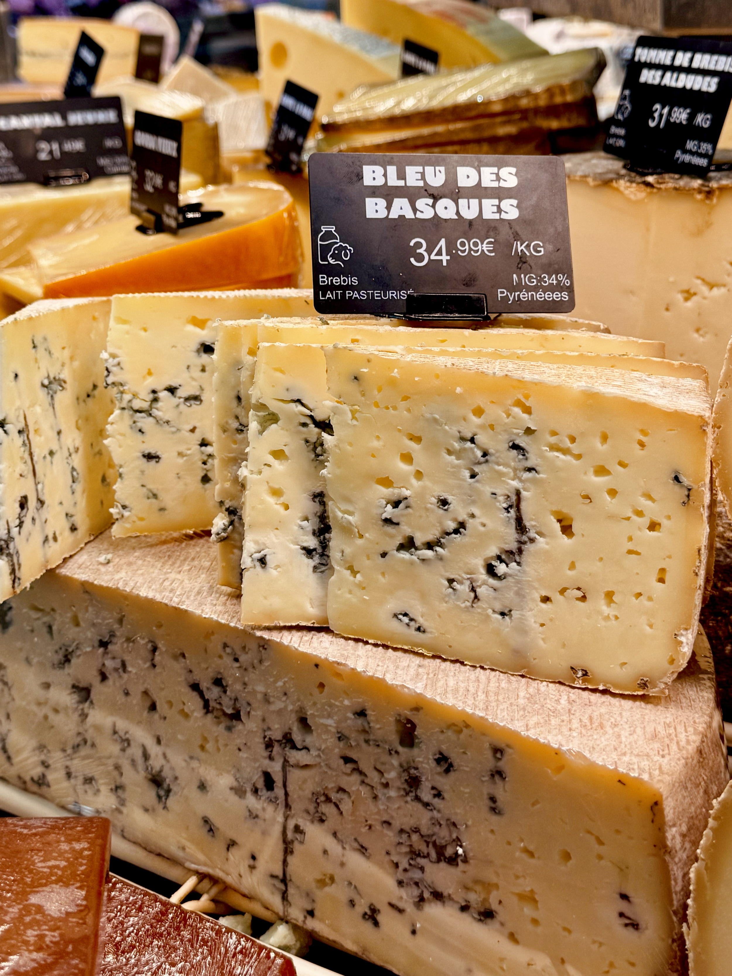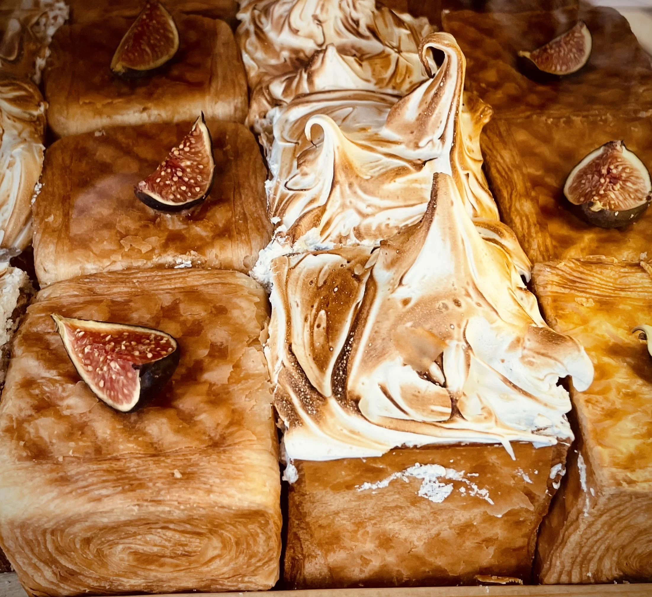 Assorted pastry squares topped with sliced figs and swirls of toasted meringue and caramel.