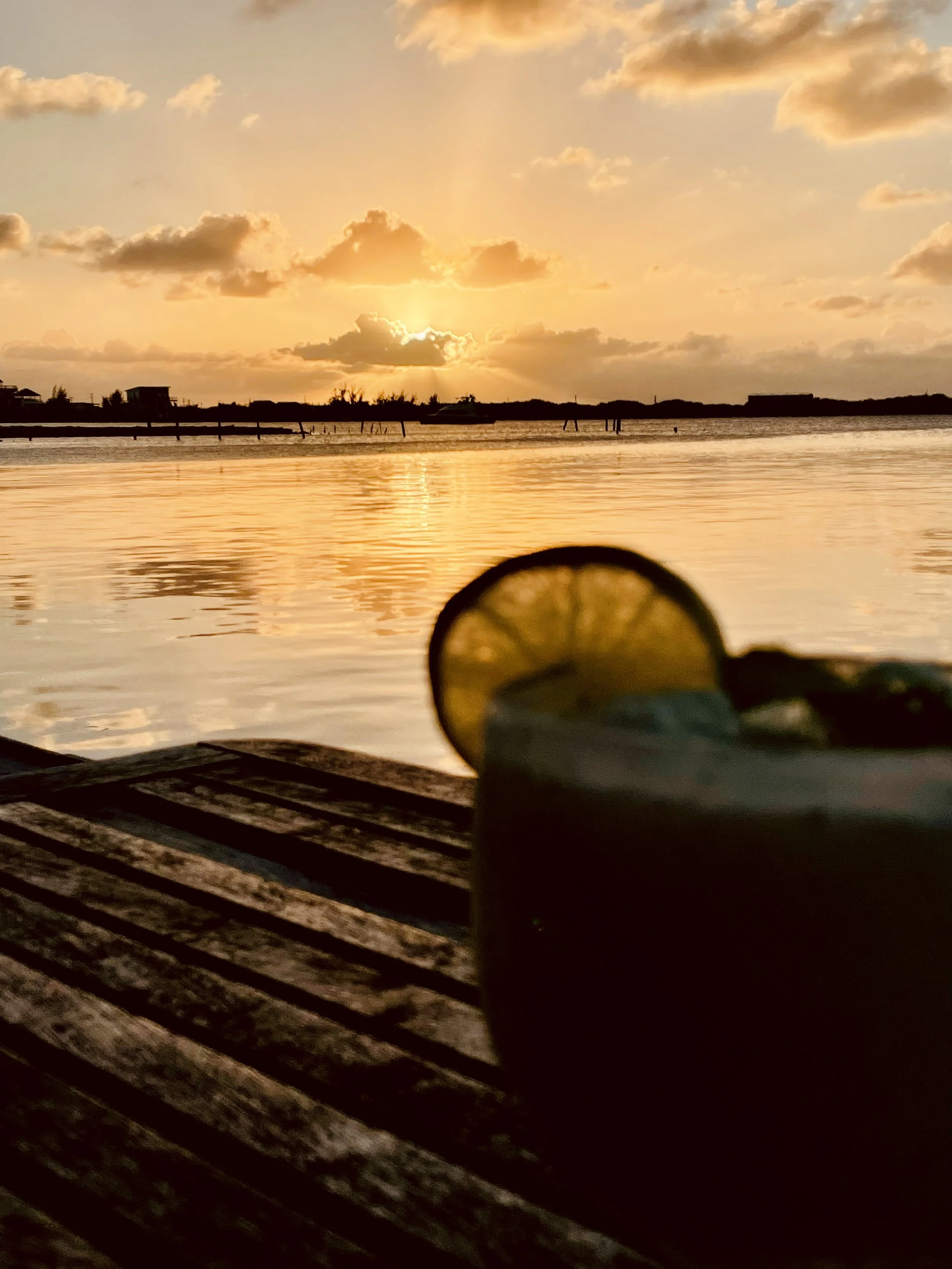 Sunset over water with a lime slice garnish on a drink in the foreground, on a wooden surface.