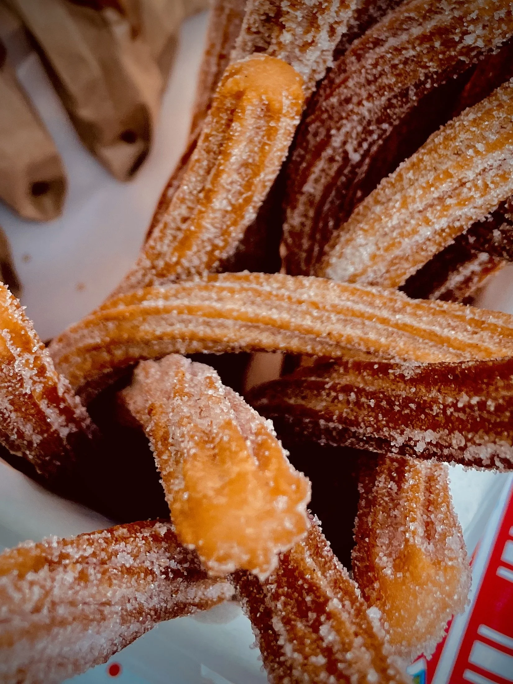 Close-up of sugar-coated churros with a bite taken out, showing the golden, crispy exterior.