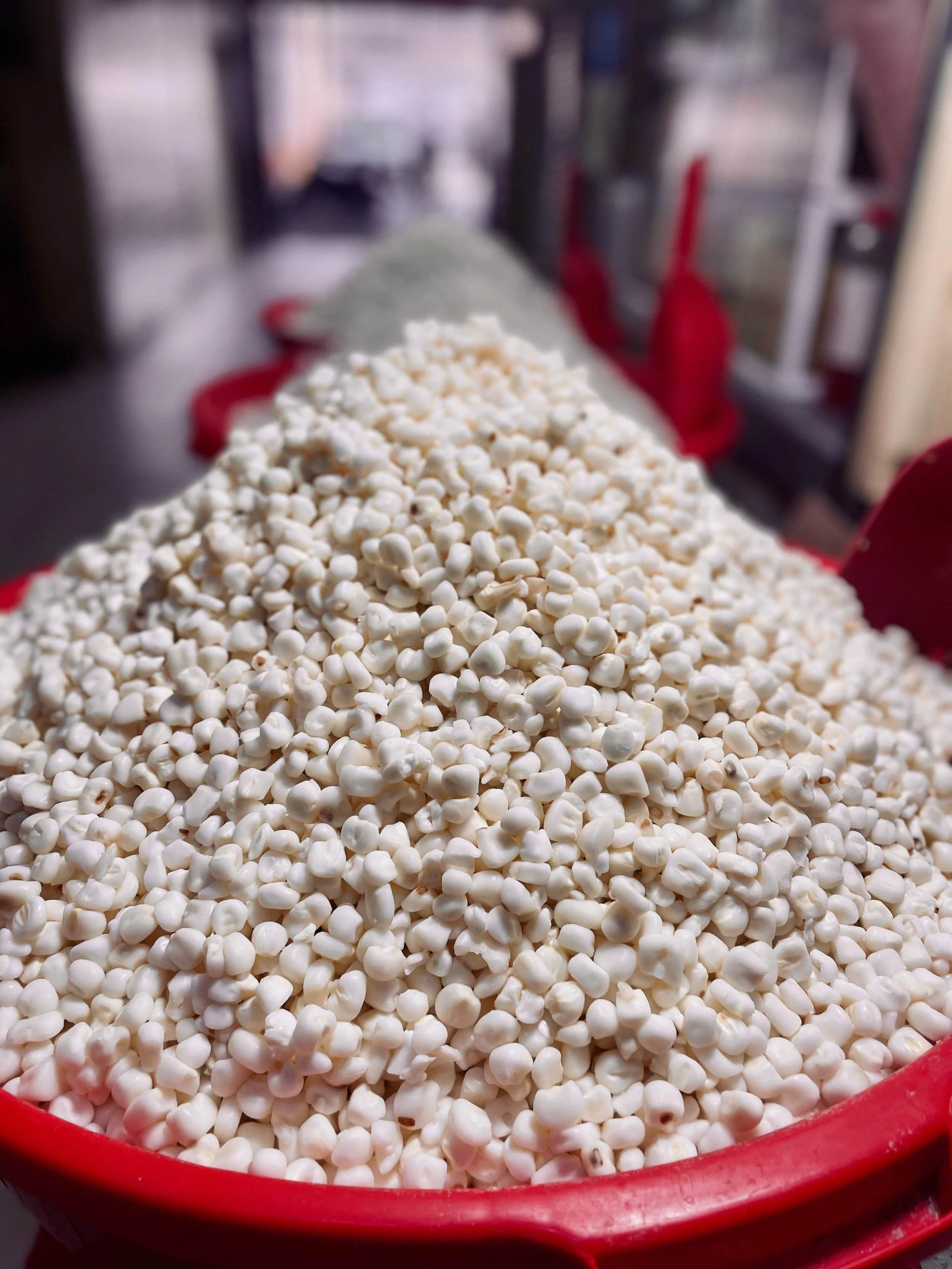 Close-up of a red bucket filled with small, white popcorn kernels in a kitchen setting.