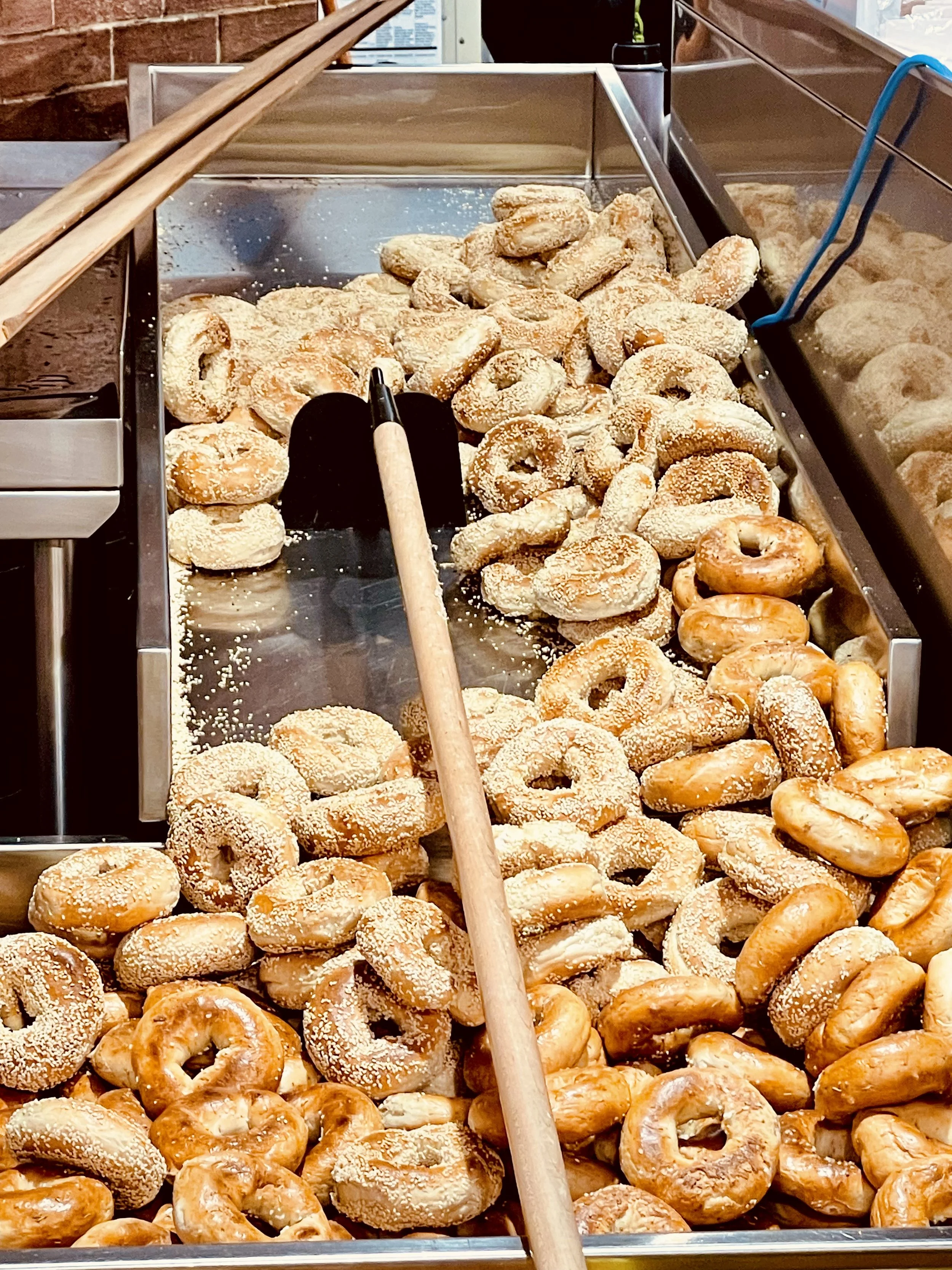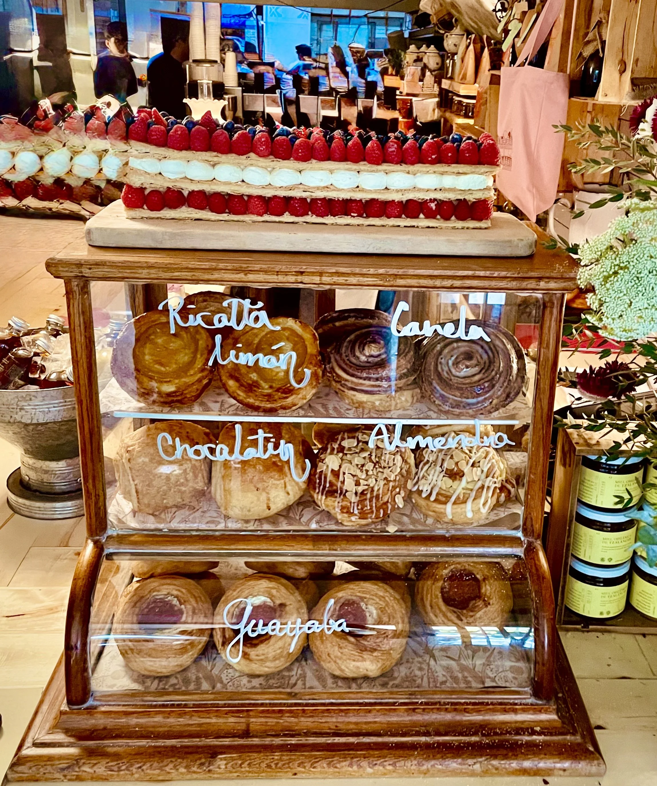 A display of assorted pastries in a bakery, including a layered raspberry cake on top, and various doughnuts labeled in Spanish, such as lemon cheesecake, cinnamon, chocolate, almond, and guava. The background shows bakery staff and equipment.