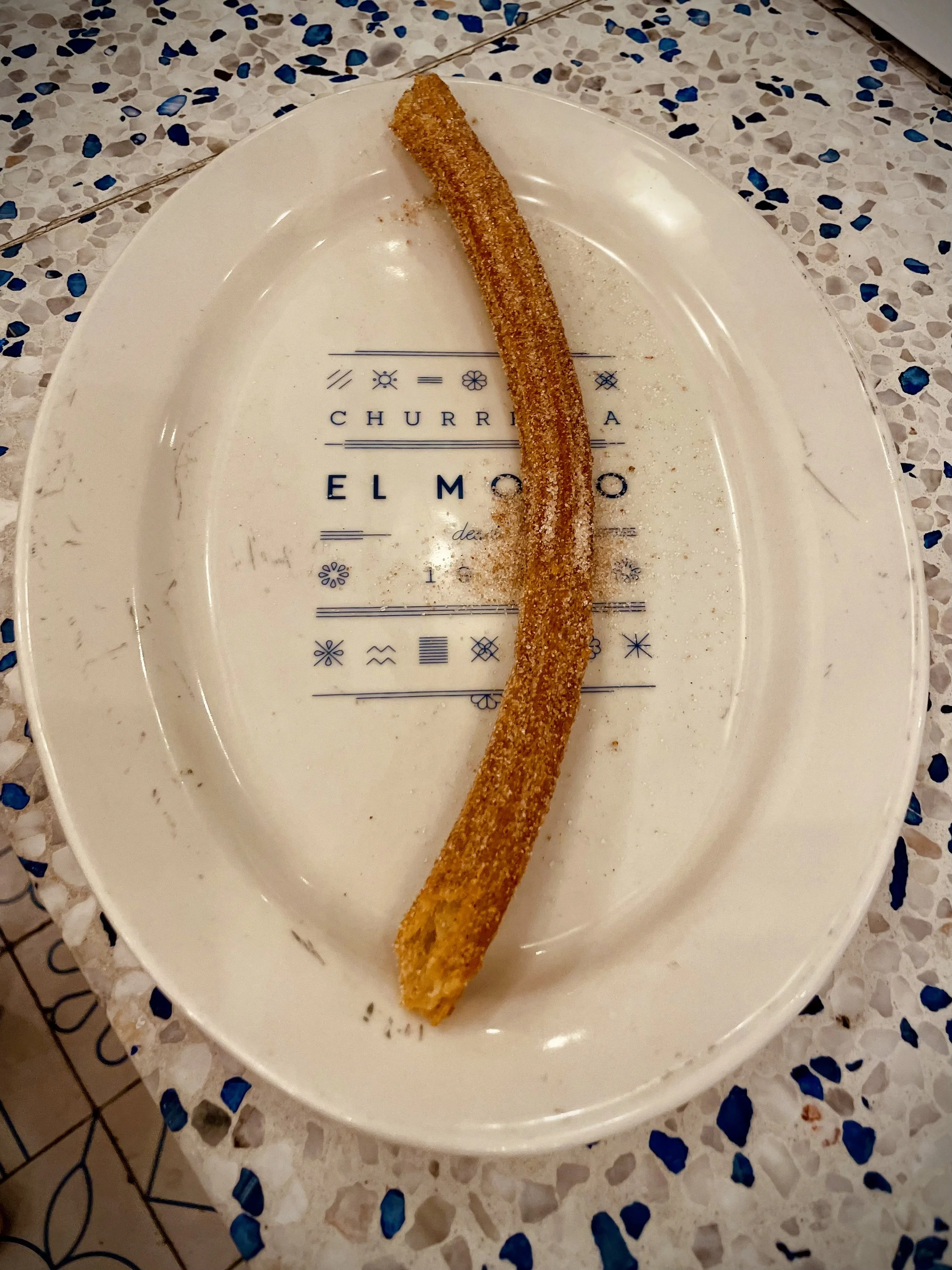 A fried churro placed on a white plate with blue decorative text and symbols, on a terrazzo countertop.