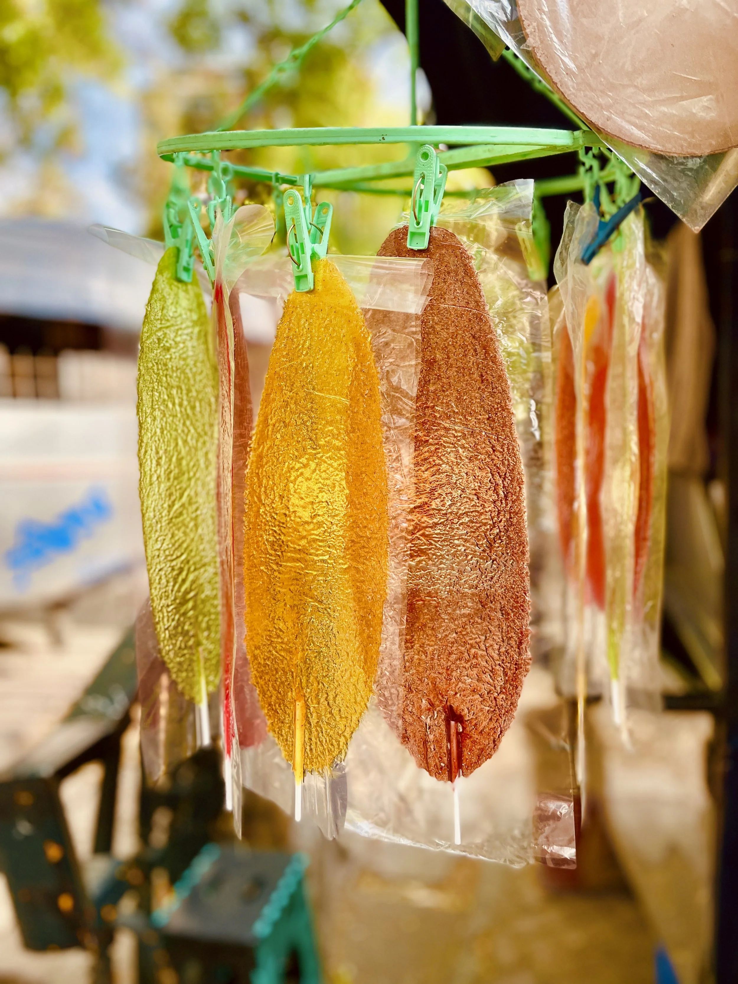 Grilled shrimp with rice in a takeout container, a green coconut in the background.