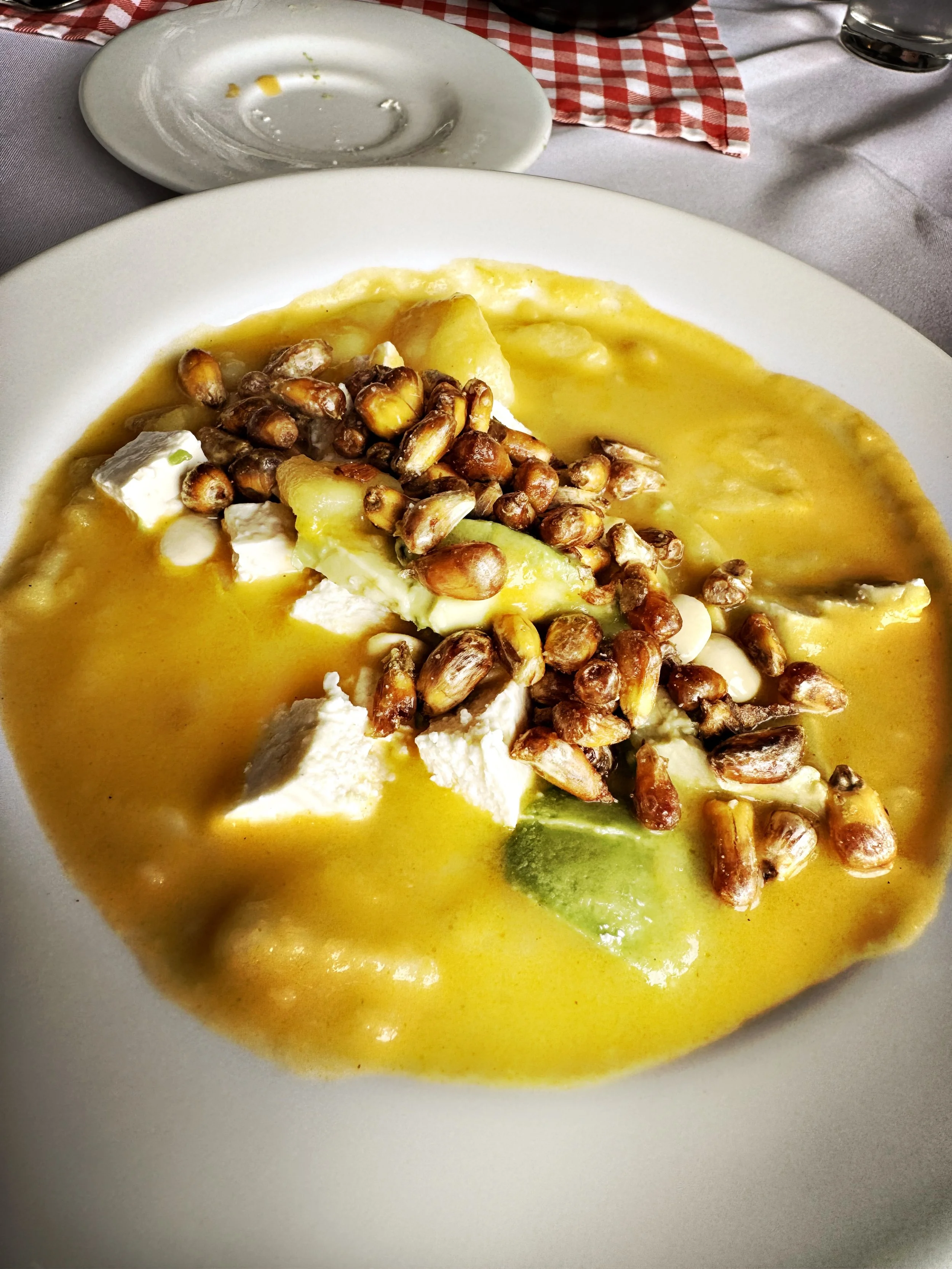 A plate of green chile stew topped with roasted corn kernels, crumbled white cheese, and chunks of potato, served on a white plate at a restaurant table.