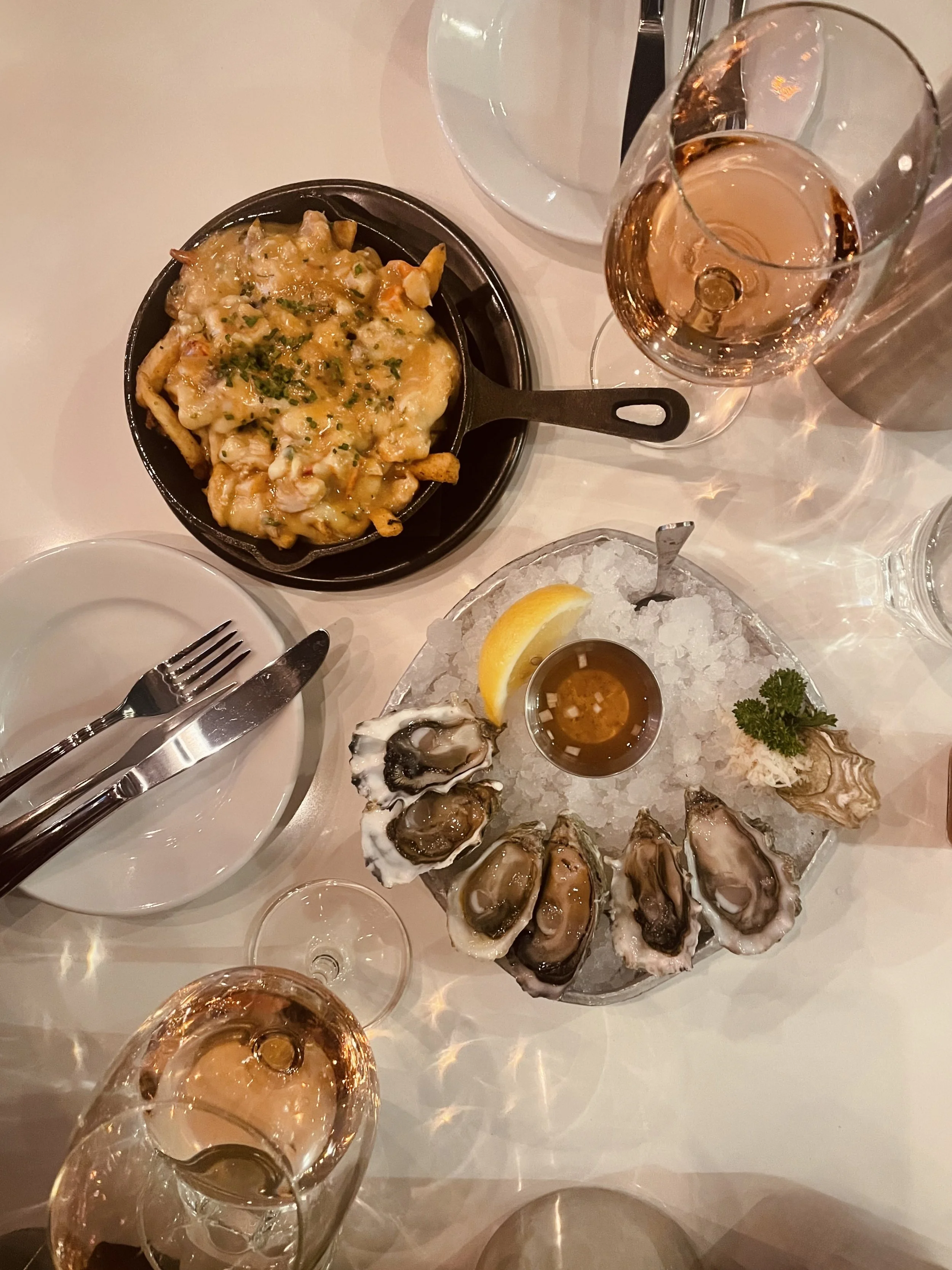 A plate of fresh oysters on ice with lemon wedge and dipping sauce, a skillet of cheesy macaroni and cheese, and glasses of rose wine on a white table.