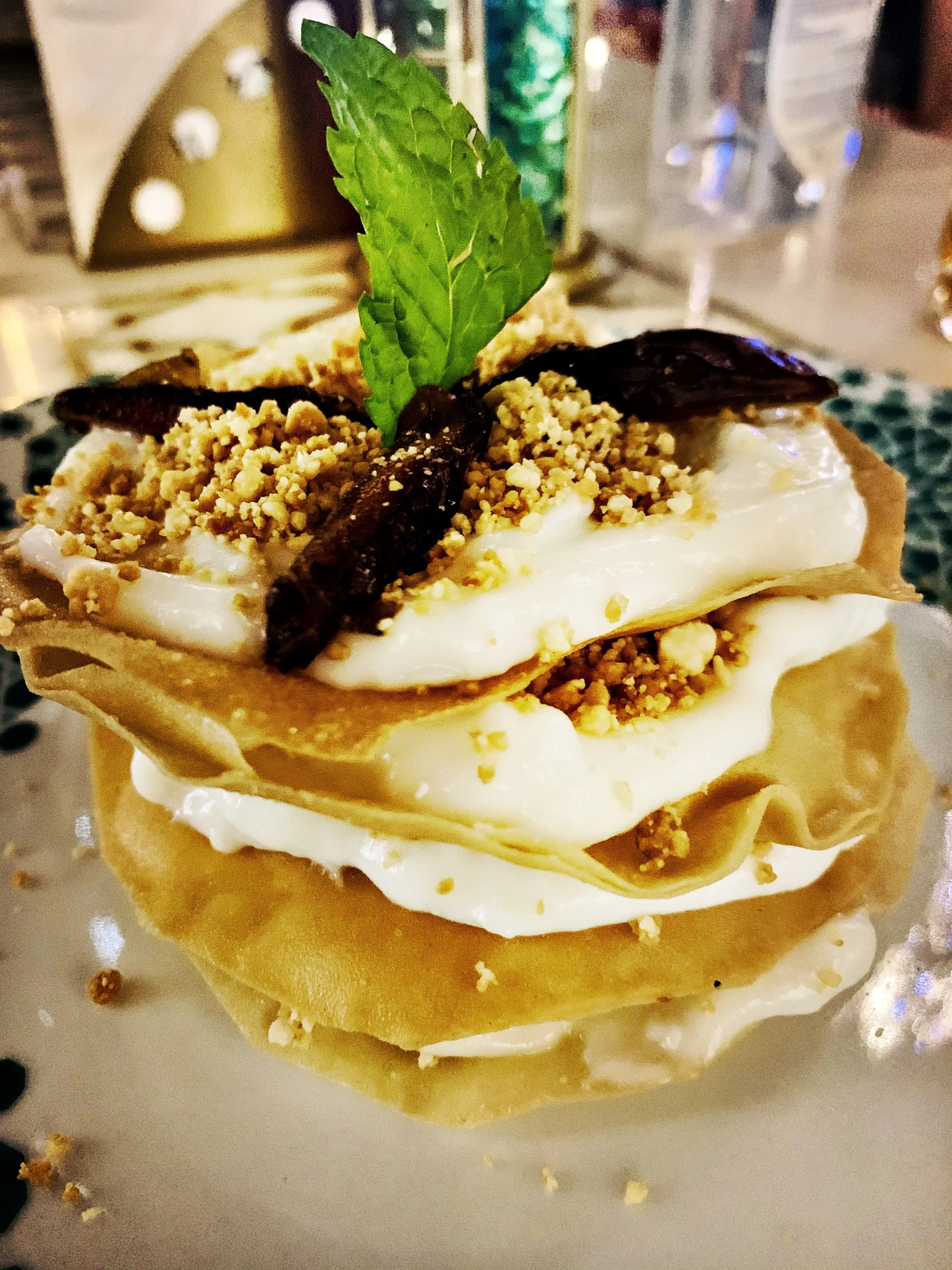 A plate of Moroccan dessert with three dark fruit pieces, a sprig of mint, and garnishes on a patterned decorative plate. A glass of beer, a fork, and a napkin with 'Bab Mansour' are also on the table.