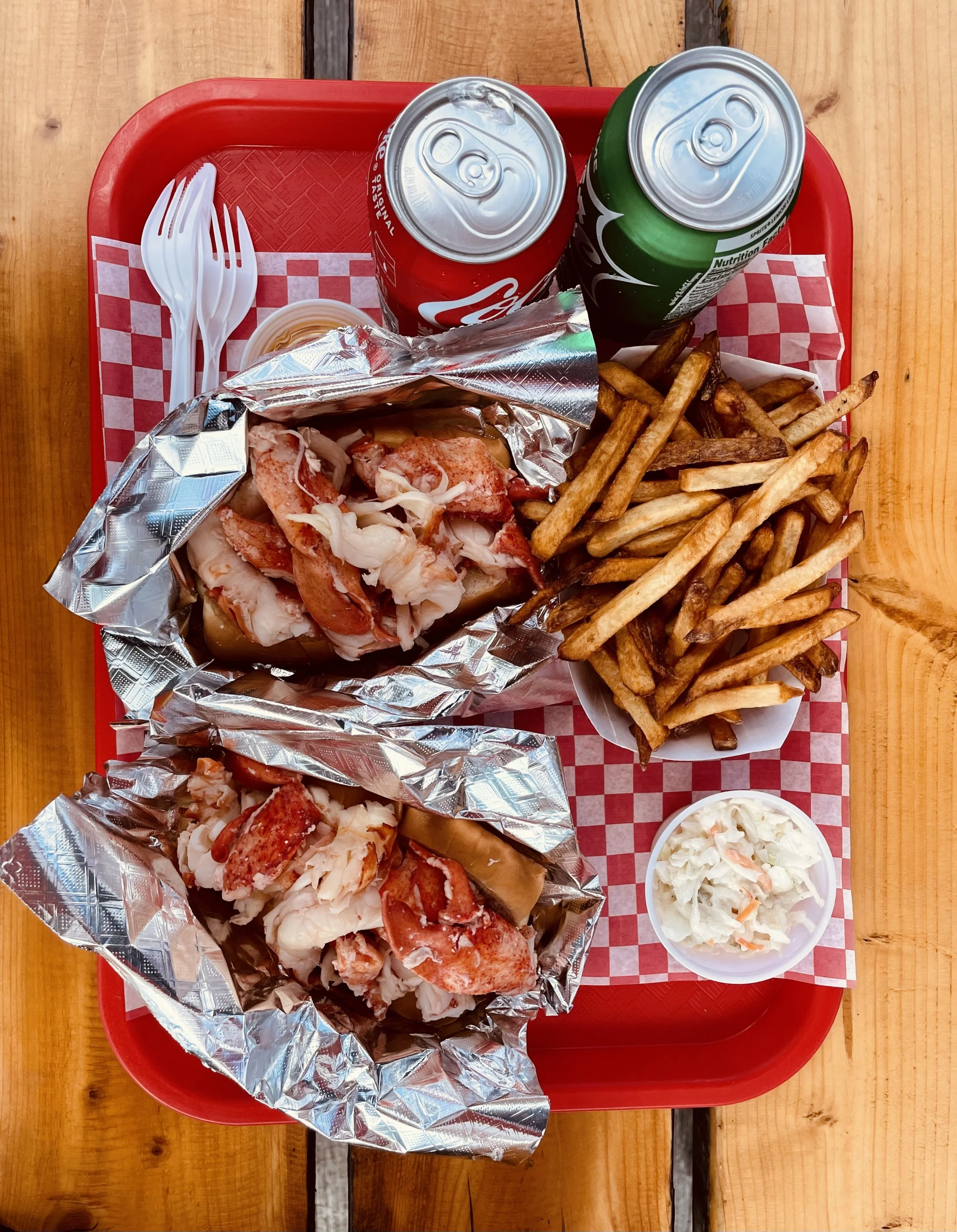 Lobster rolls with French fries, coleslaw, and two cans of soda on a red tray