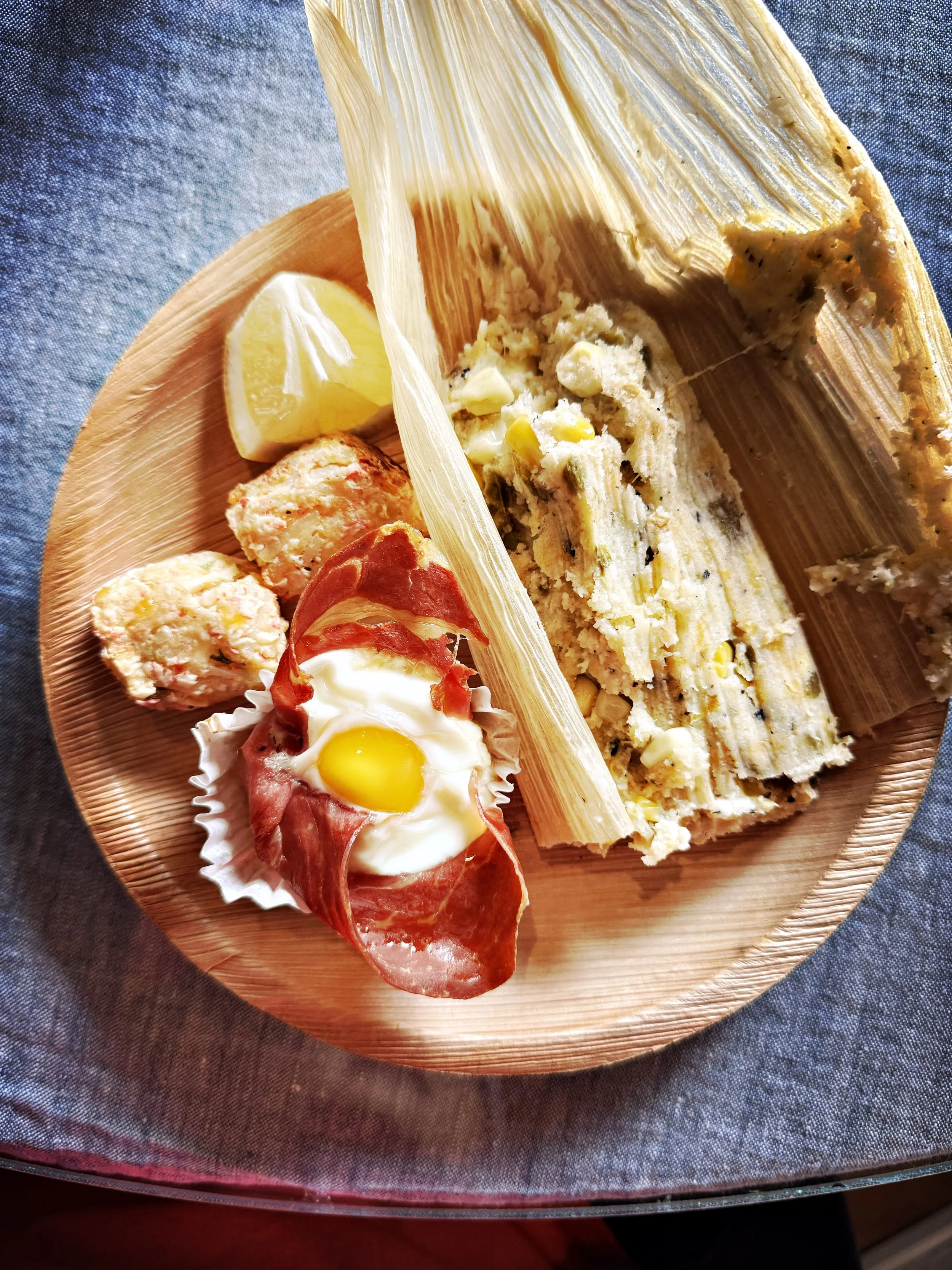 A wooden plate contains a slice of corn casserole, a lemon wedge, two pastry balls, and a cup with a fried egg wrapped in prosciutto.