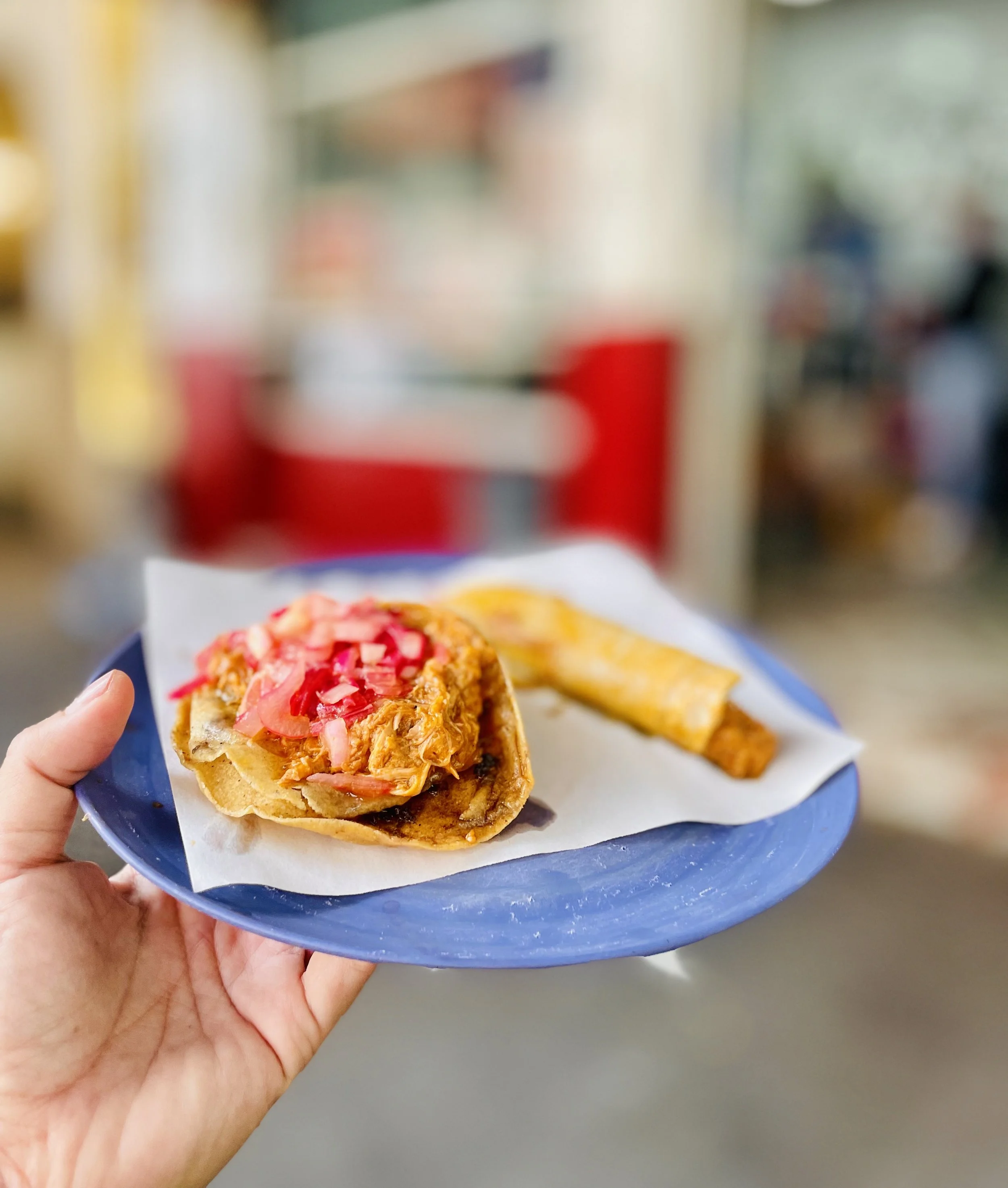 A hand holding a blue plate with a taco filled with shredded meat, chopped onions, and diced tomatoes, along with a serving of French fries, in a casual setting.