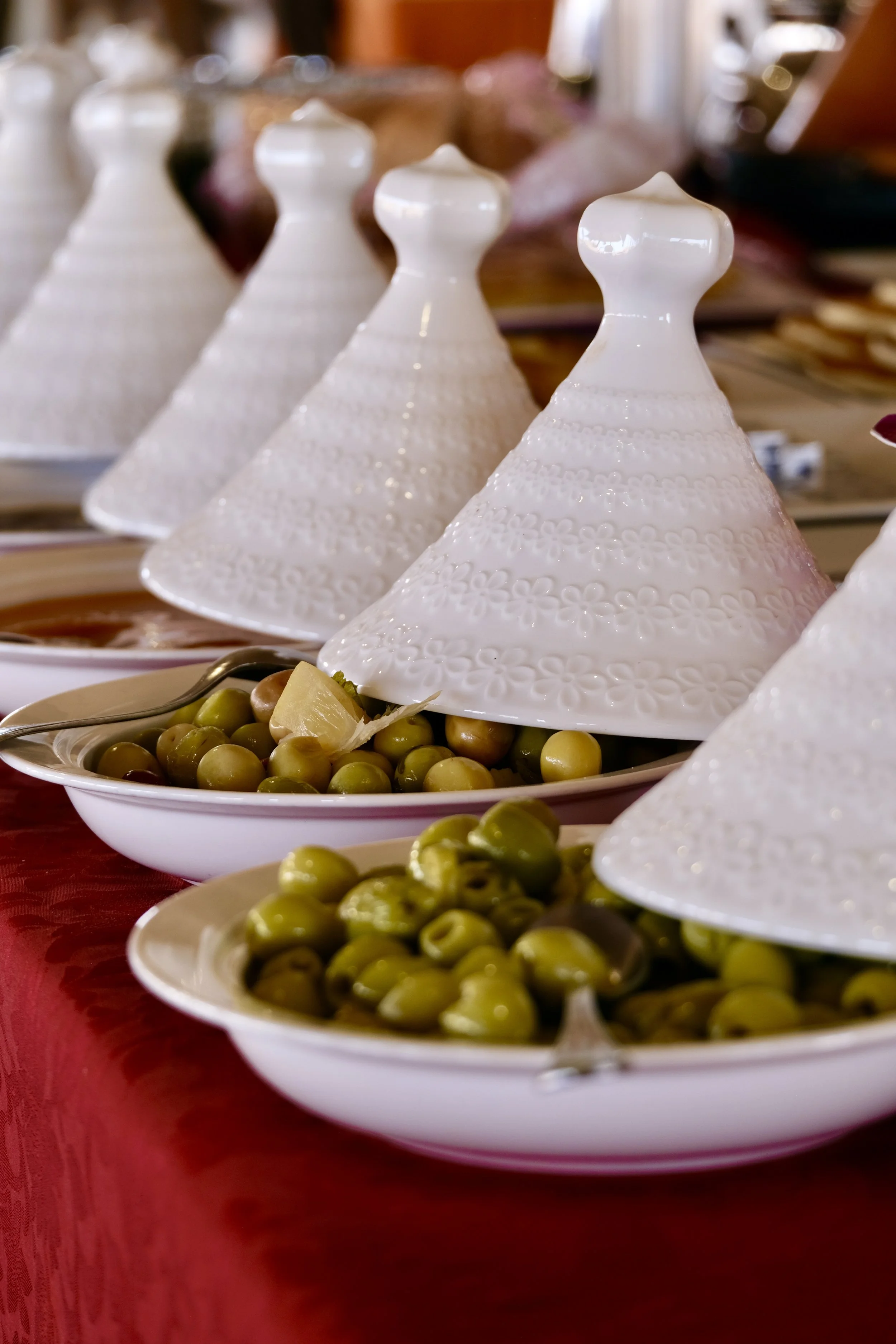 A table setting with white ceramic dishes covered with decorative covers, serving green olives and lemon wedges.