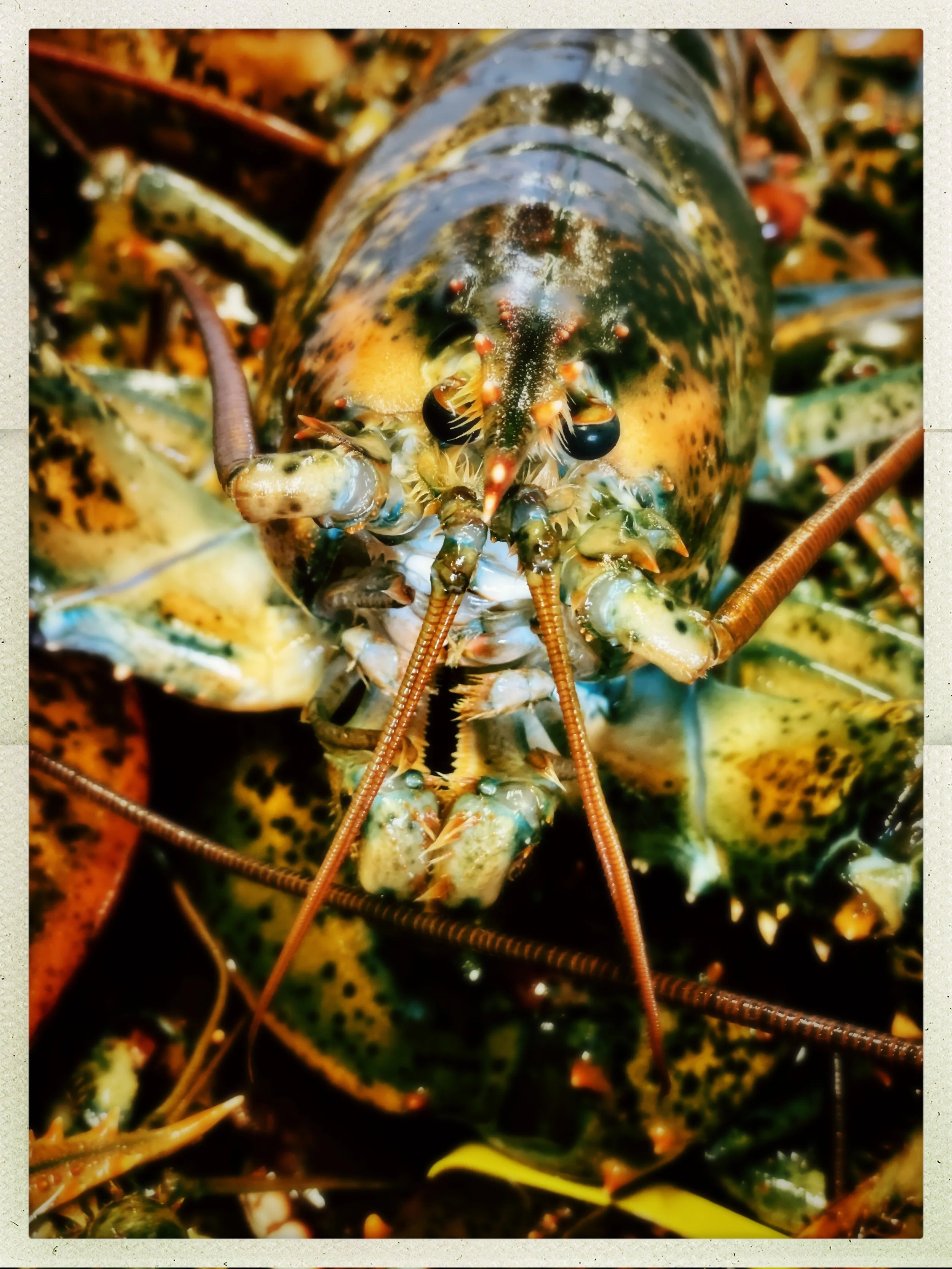 Close-up of a colorful lobster with spotted and striped markings on a bed of seaweed.