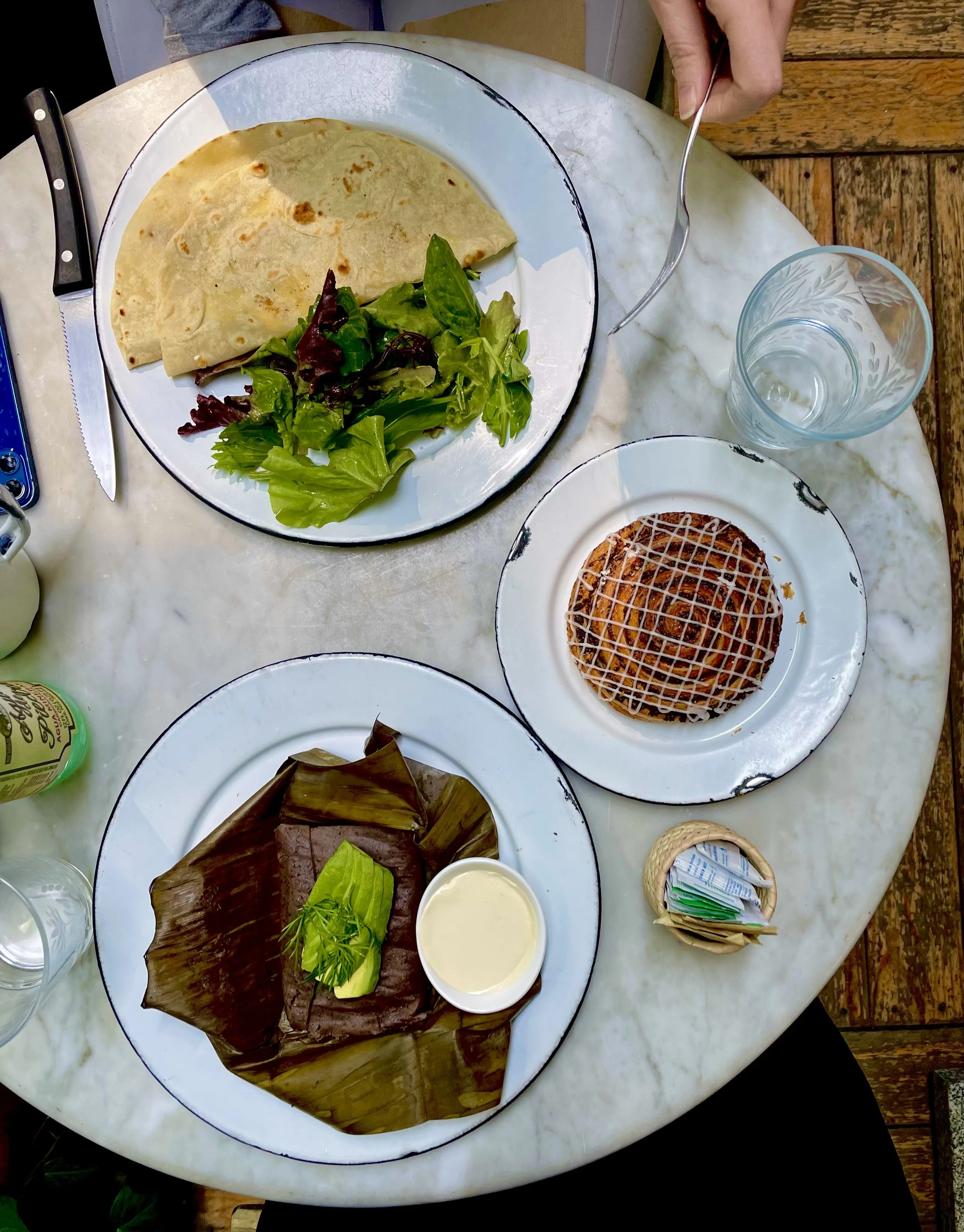 A marble table with three plates of food: a quesadilla with salad, a plate of spaghetti with sauce covered with a wire mesh, and a piece of cooked meat with a small cup of sauce or dressing, and two glasses of water.