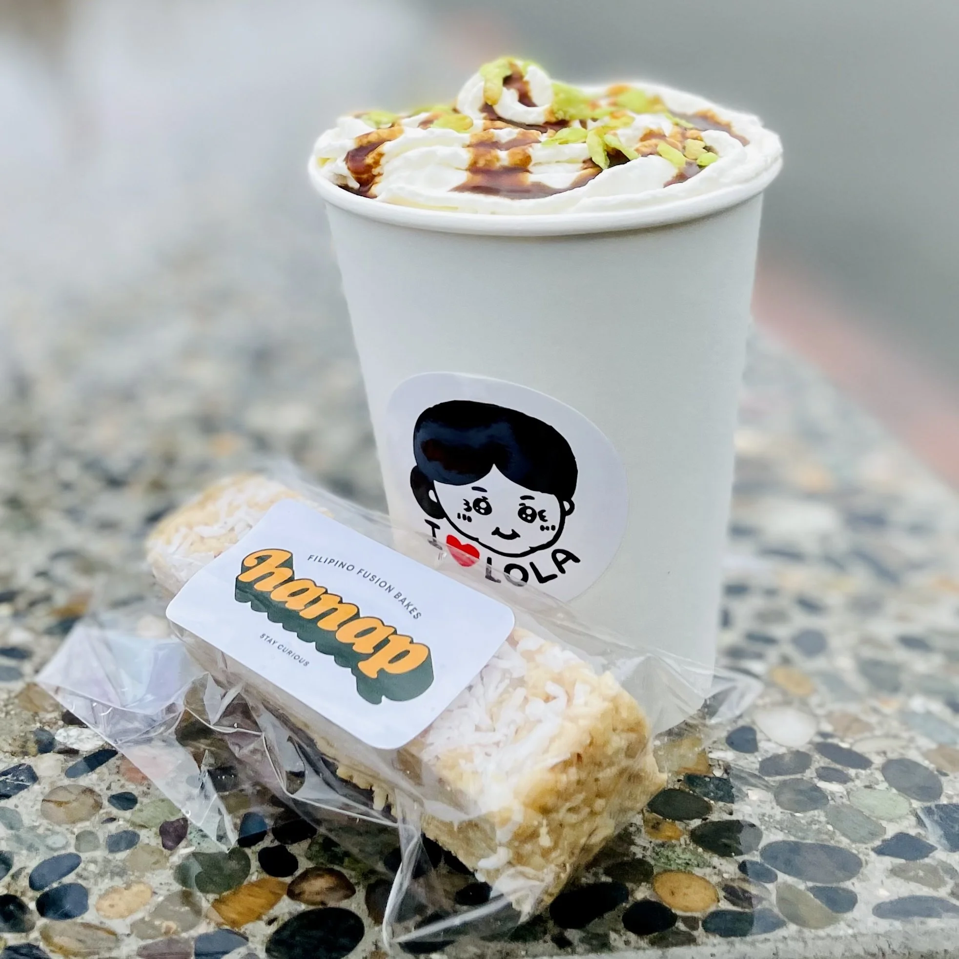 A cup of whipped cream topped with chocolate syrup and chopped nuts, a cookie bar with coconut flakes in clear packaging, both on a speckled gray surface.