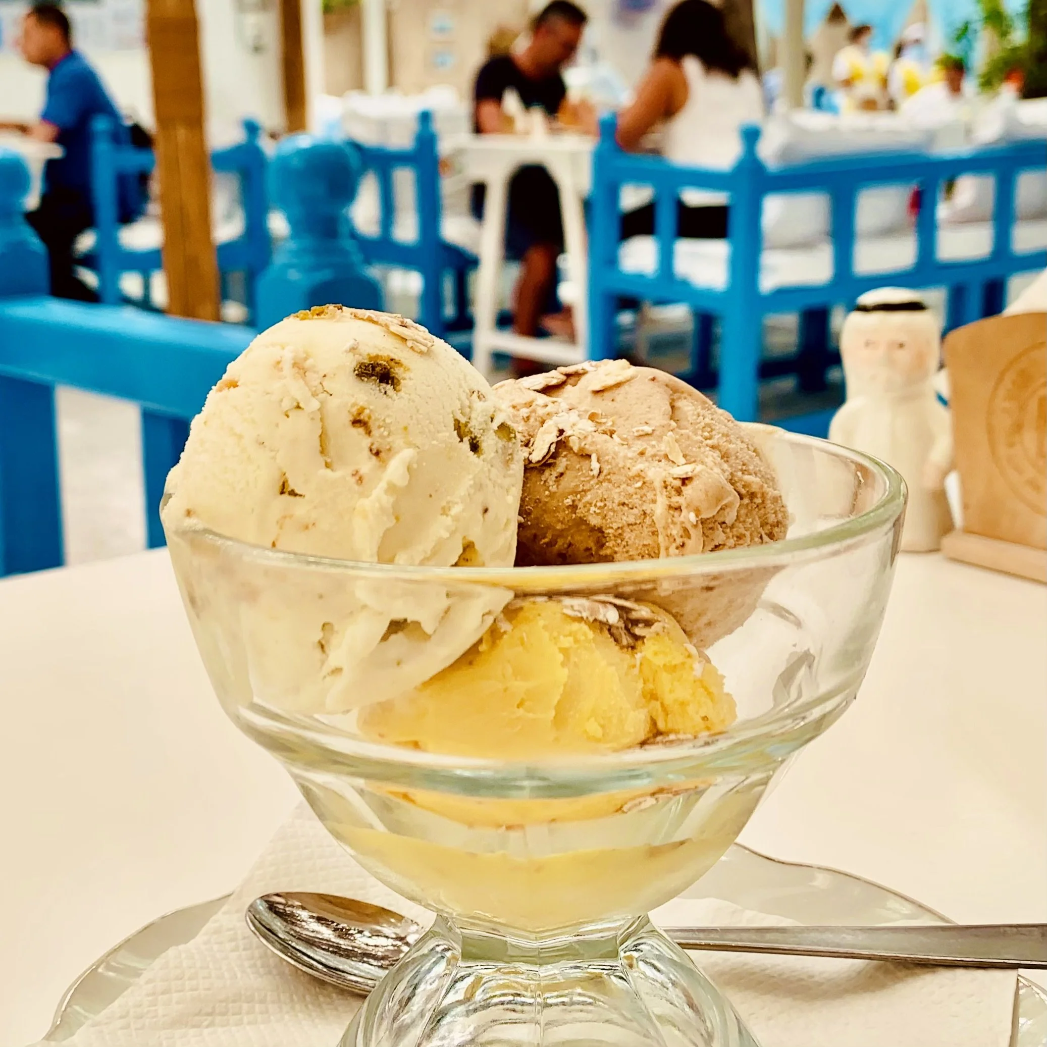 A glass bowl of three scoops of ice cream on a table, with a busy restaurant in the background featuring blue chairs and people dining.