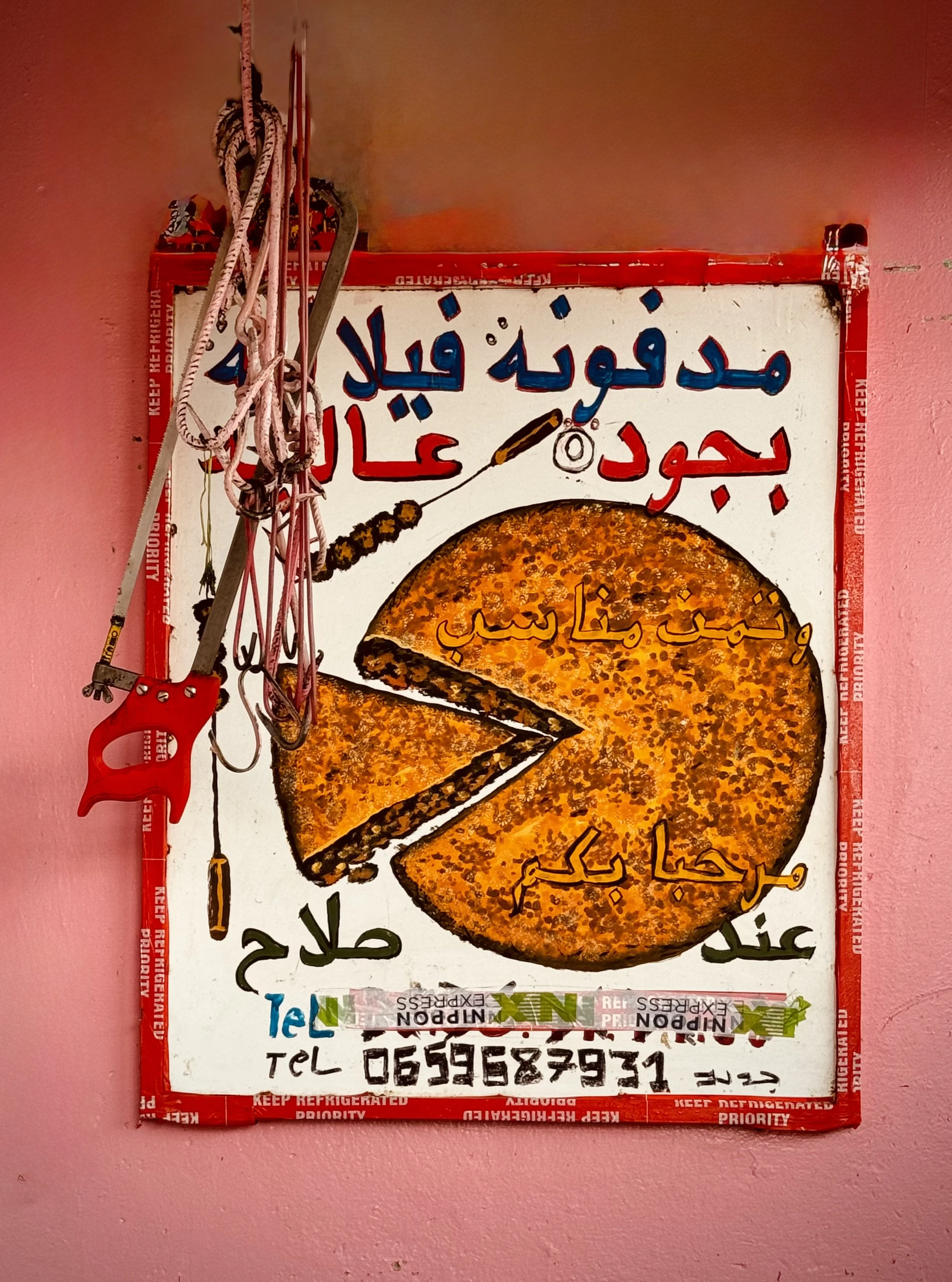 Hand-painted sign advertising baked chicken with a pie illustration, written in Arabic, with laces and tools hanging next to it.