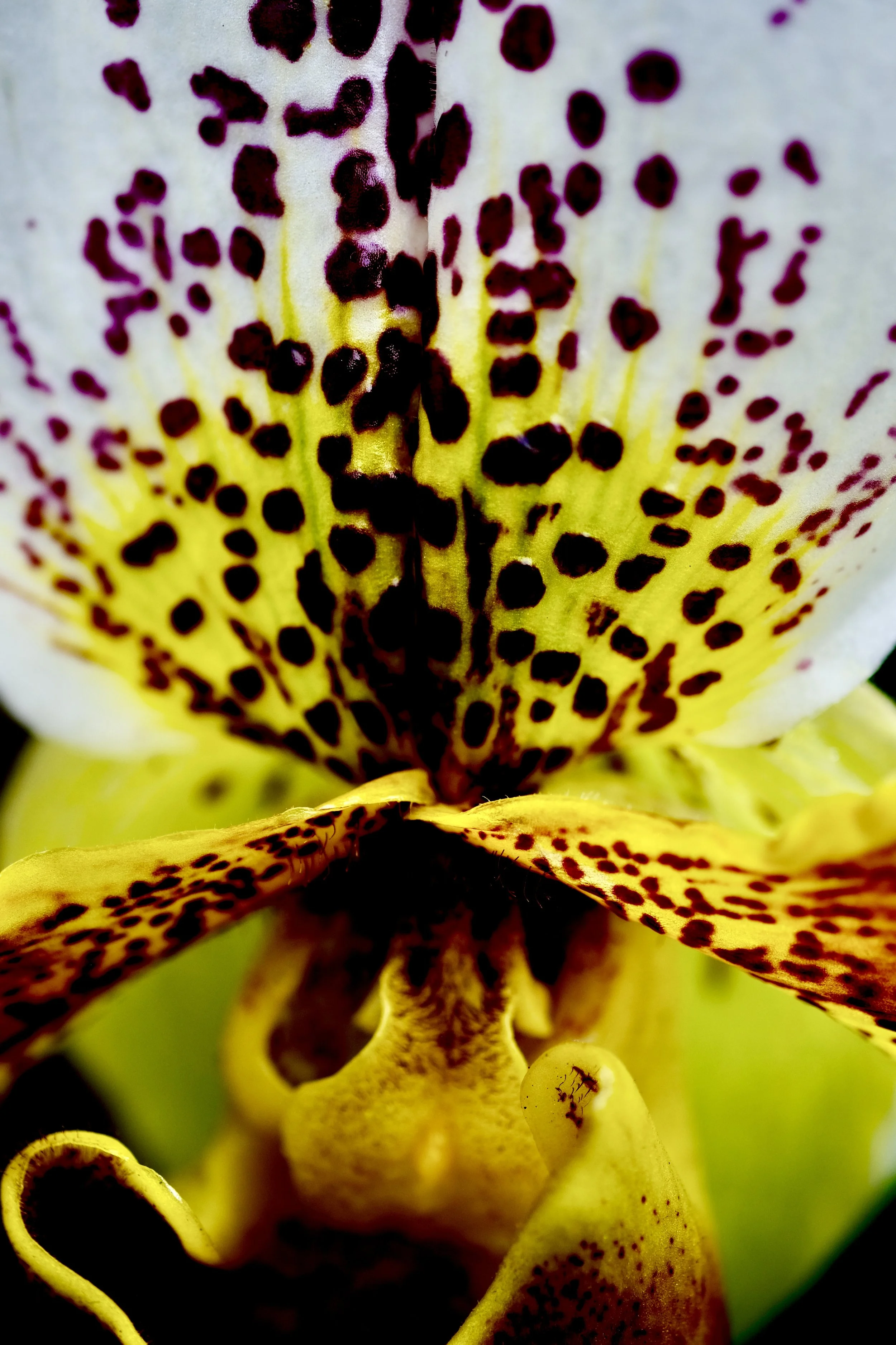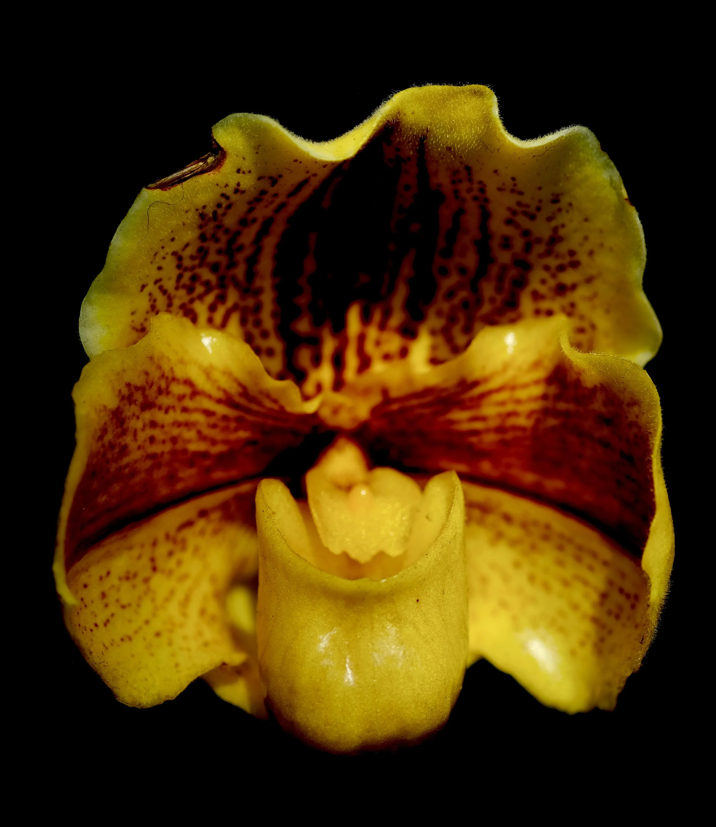 Close-up of a yellow and red spotted orchid flower with intricate details against a black background.