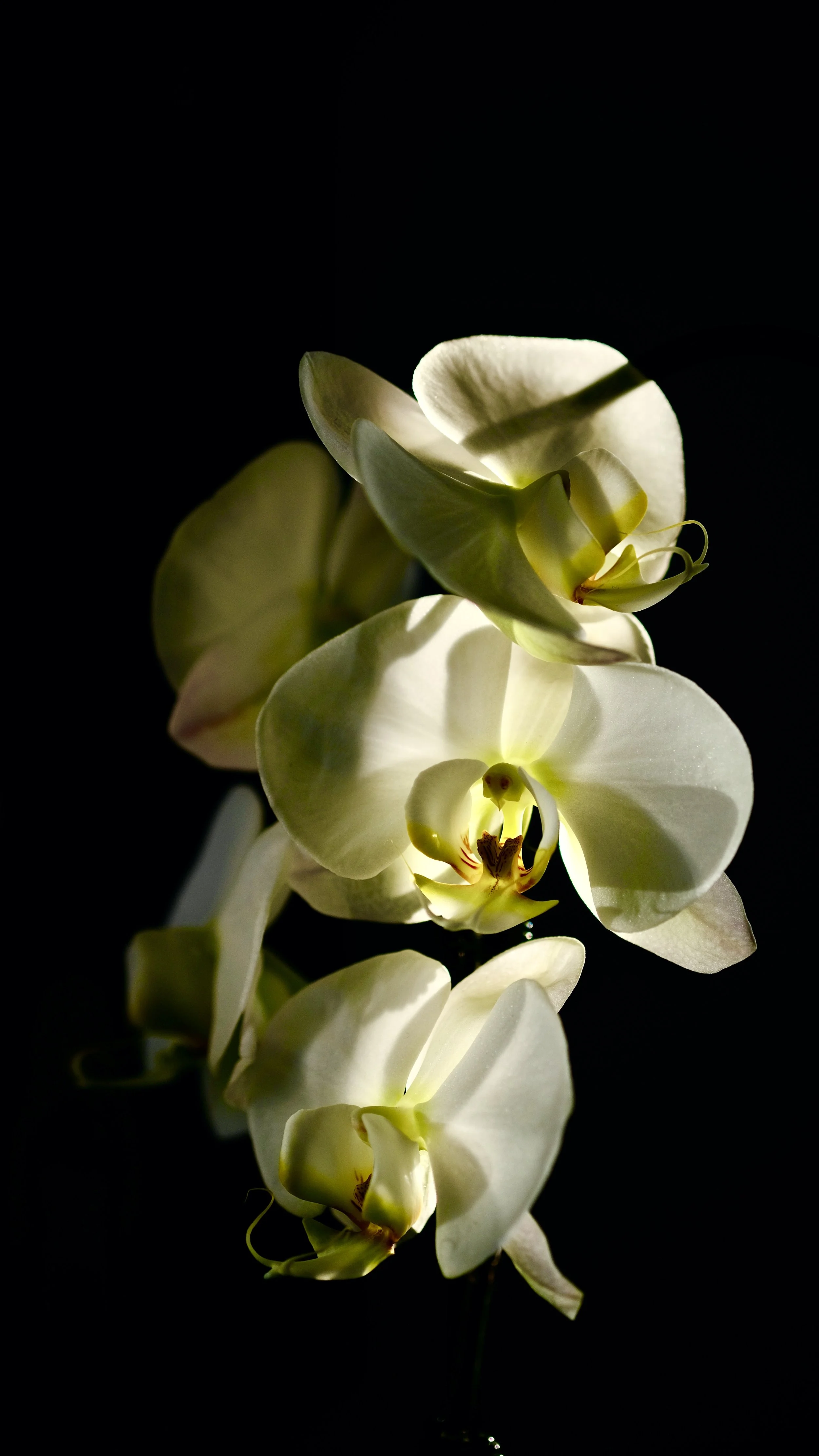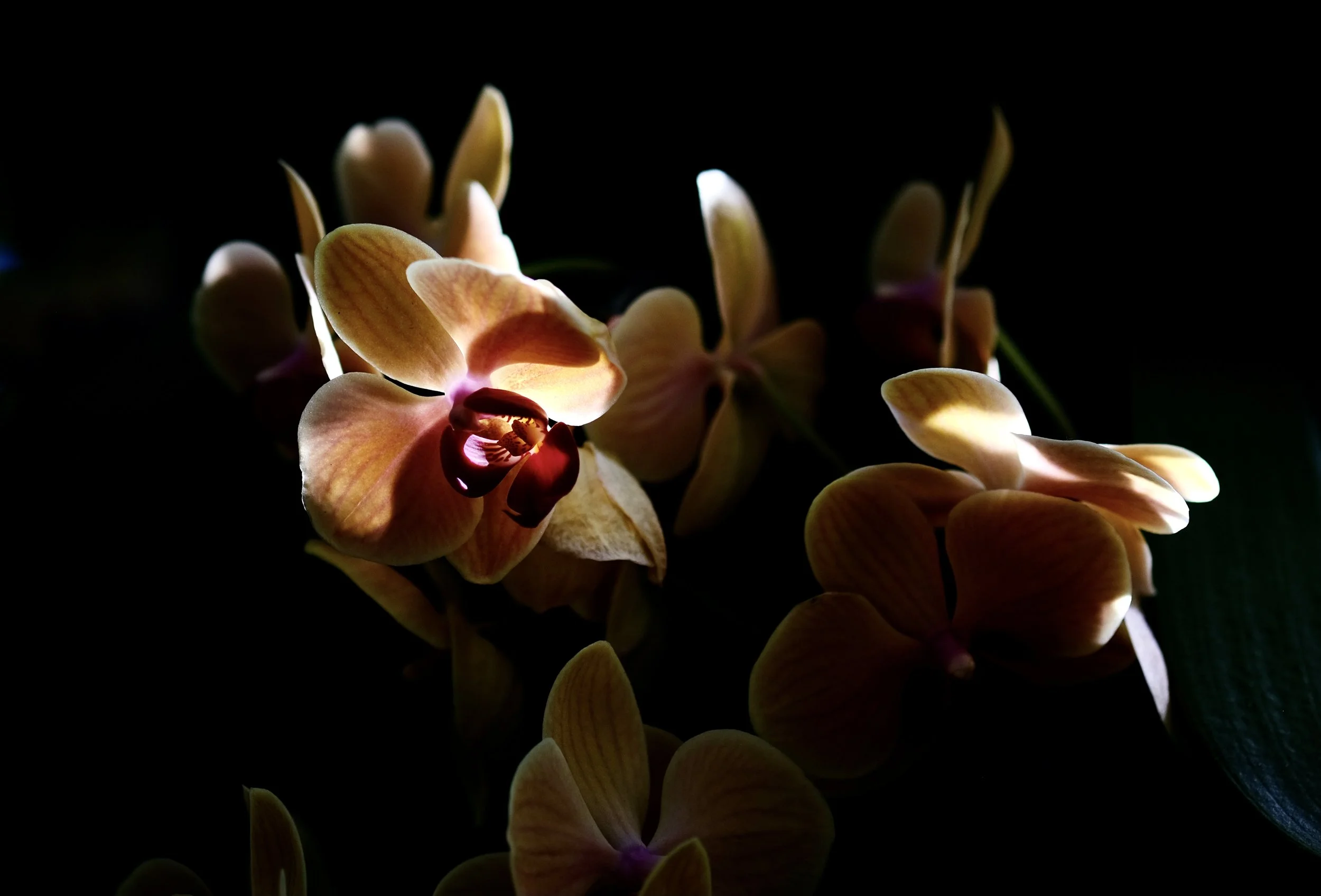 Close-up of a cluster of light-colored orchids with a dark background, highlighting the flowers' delicate petals and central structure.