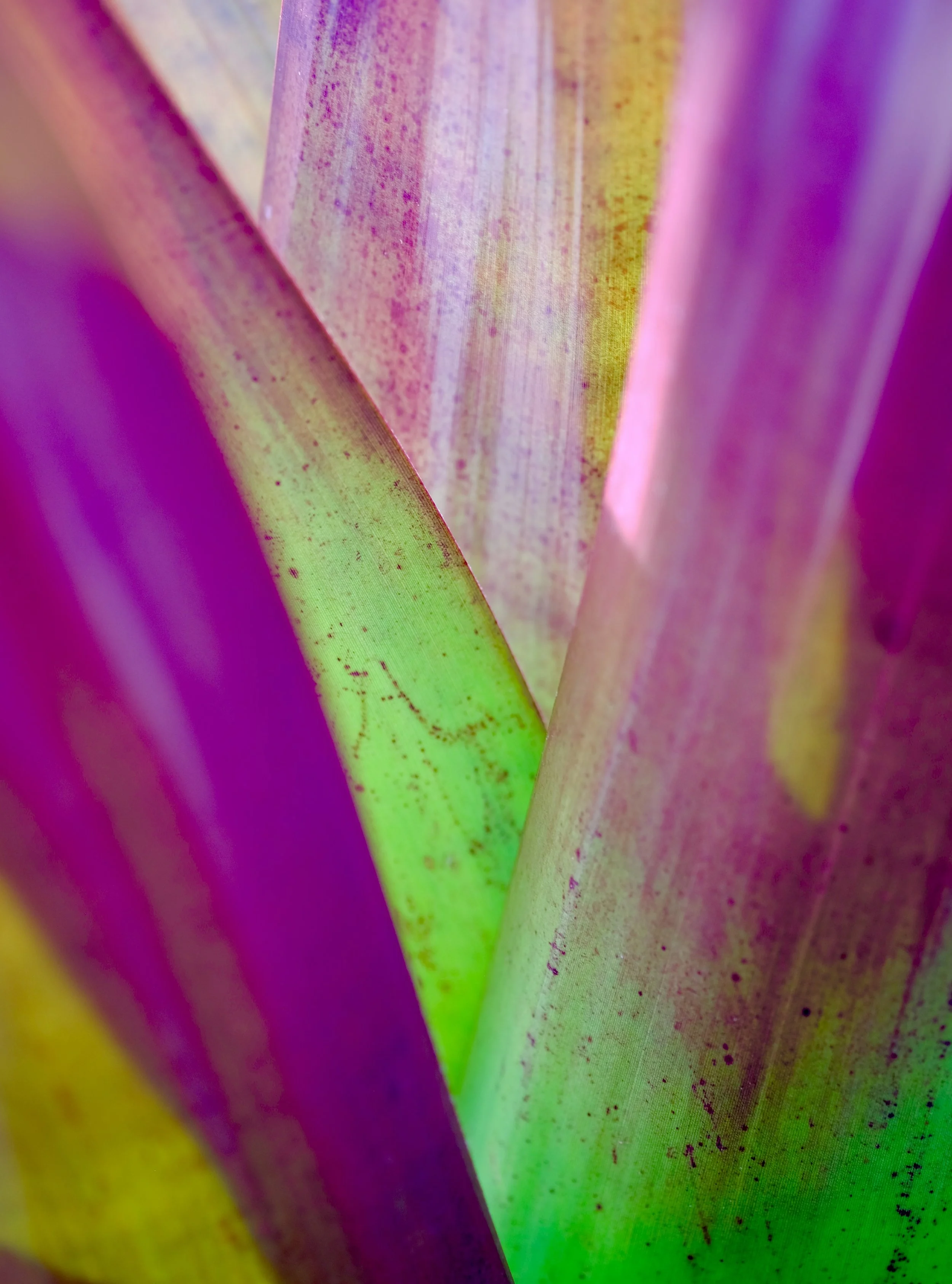 Close-up of colorful plant leaves, showing pink, purple, yellow, and green hues with detailed textures.