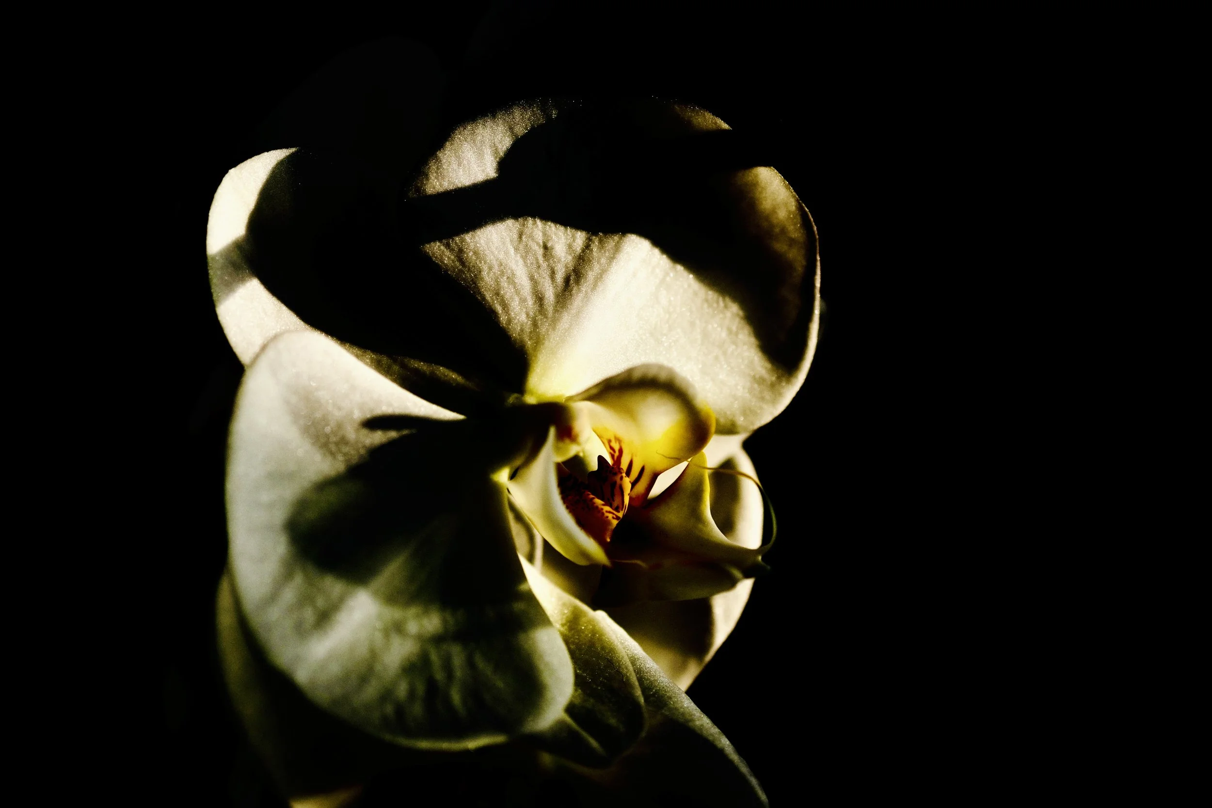 Close-up of a white orchid flower with yellow and red center, illuminated against a dark background.