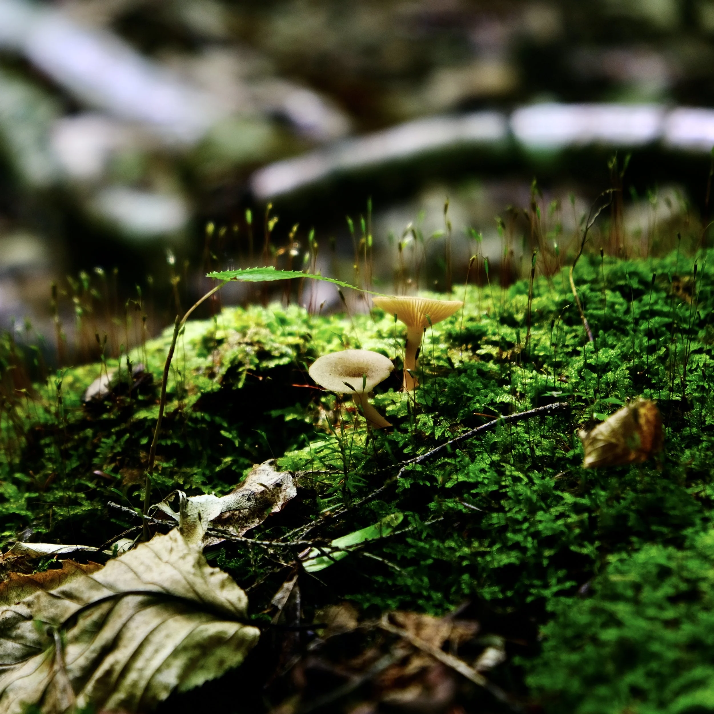 Close-up of mushrooms growing on a moss-covered forest floor with fallen leaves.