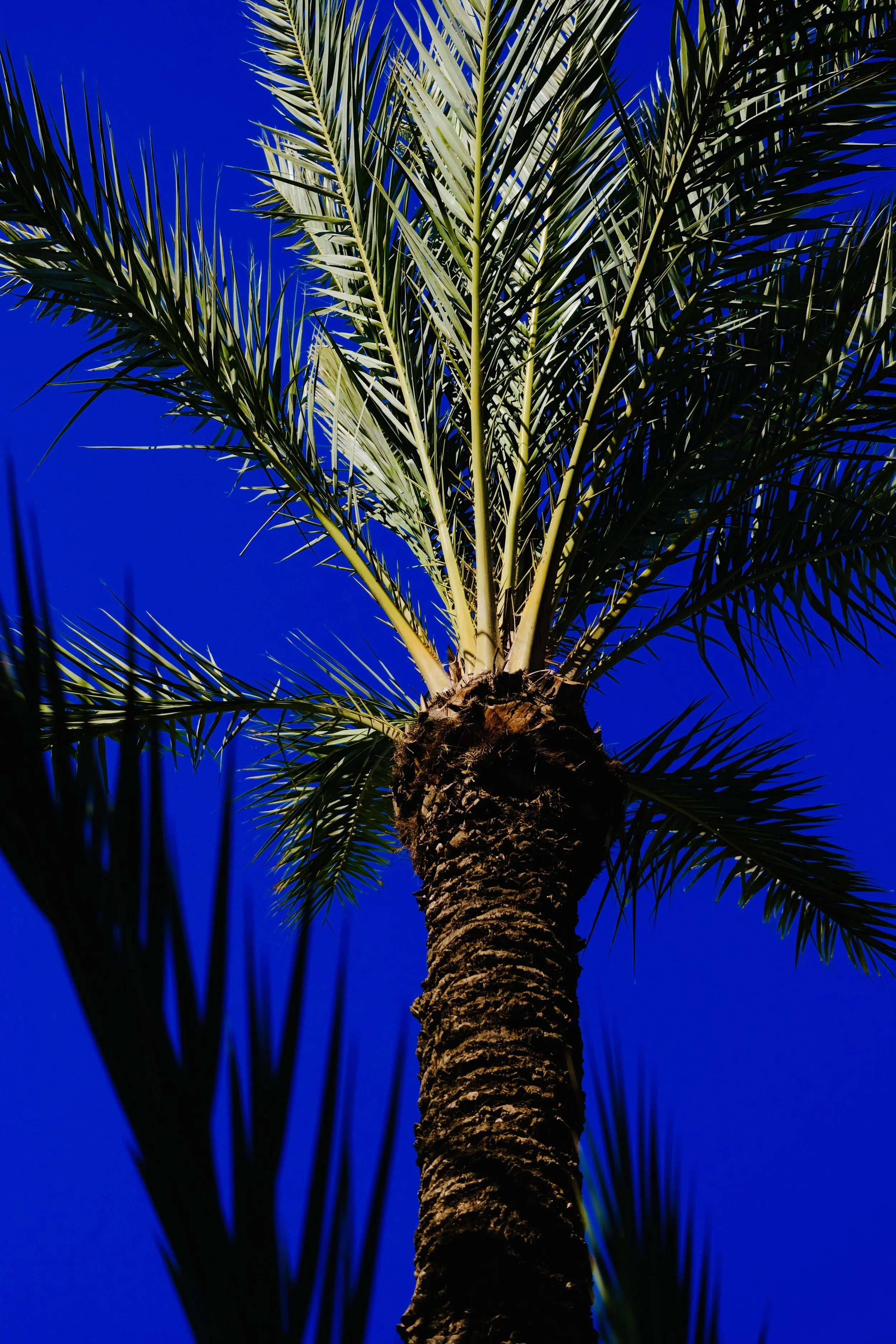 Close-up of a palm tree with a rough textured trunk and green fronds against a clear blue sky.