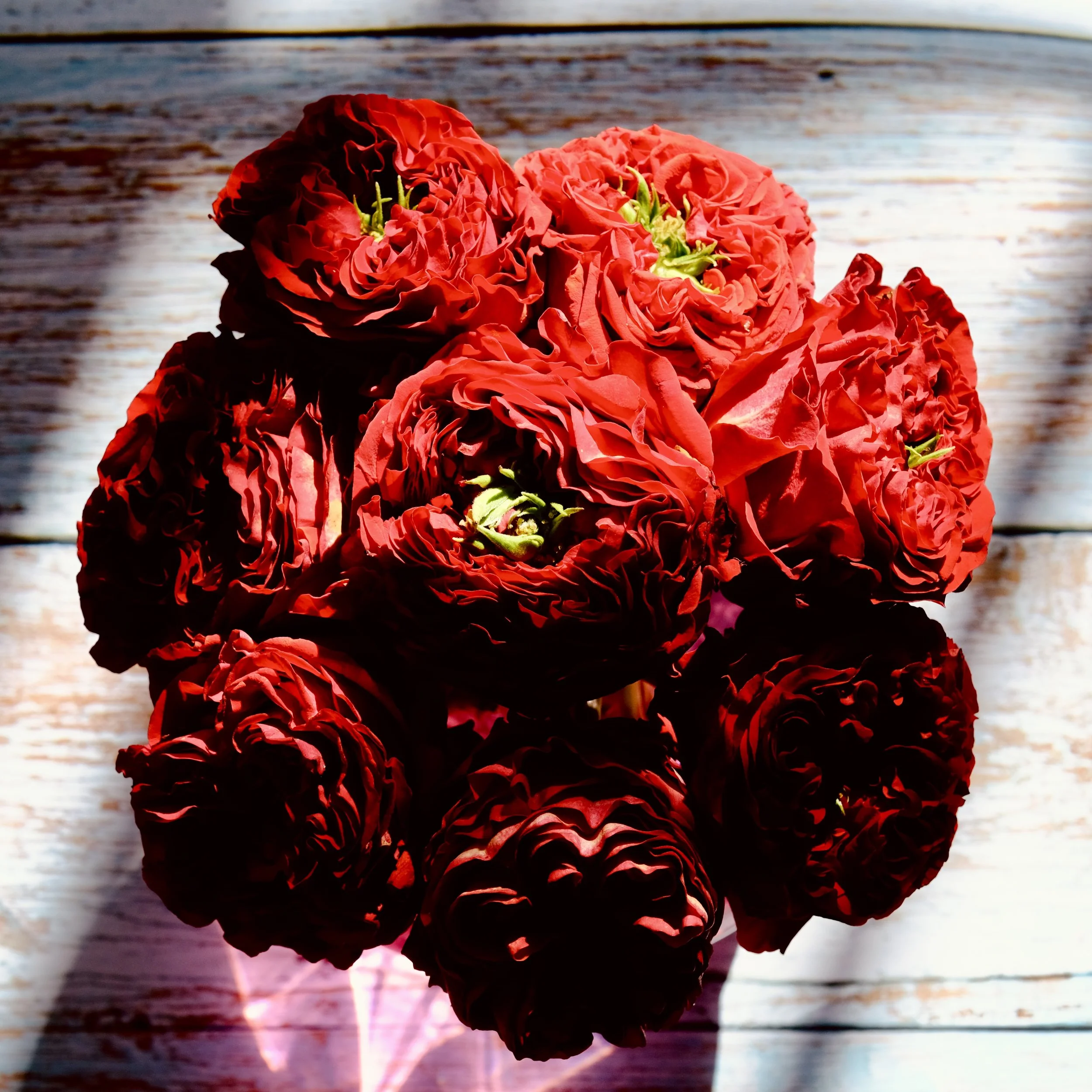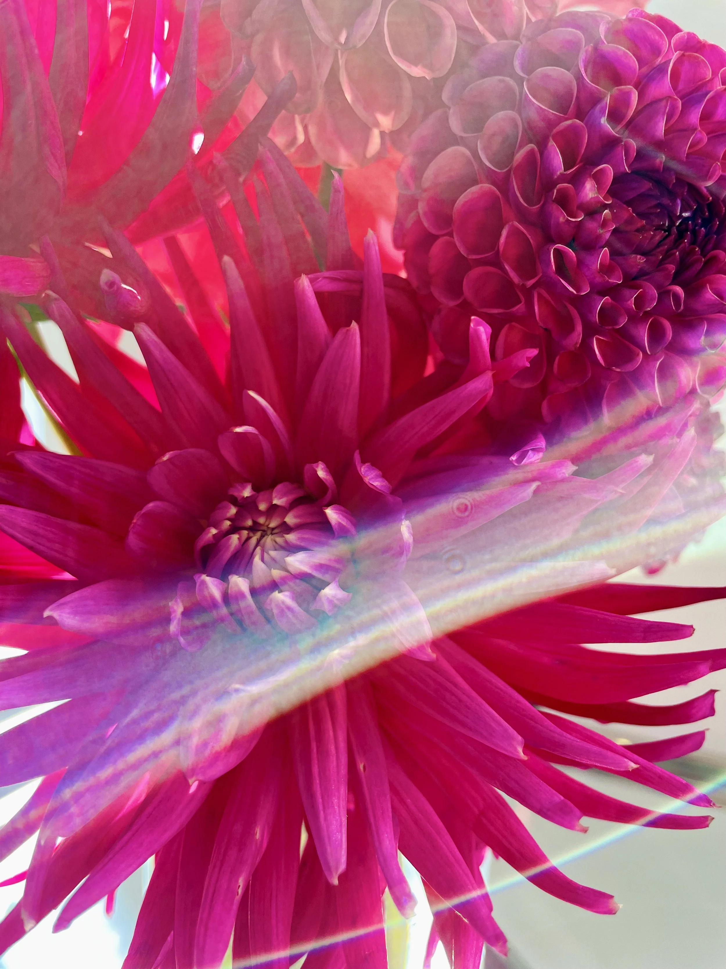 Close-up of vibrant pink and purple flowers with a rainbow-like light reflection streak across the image.