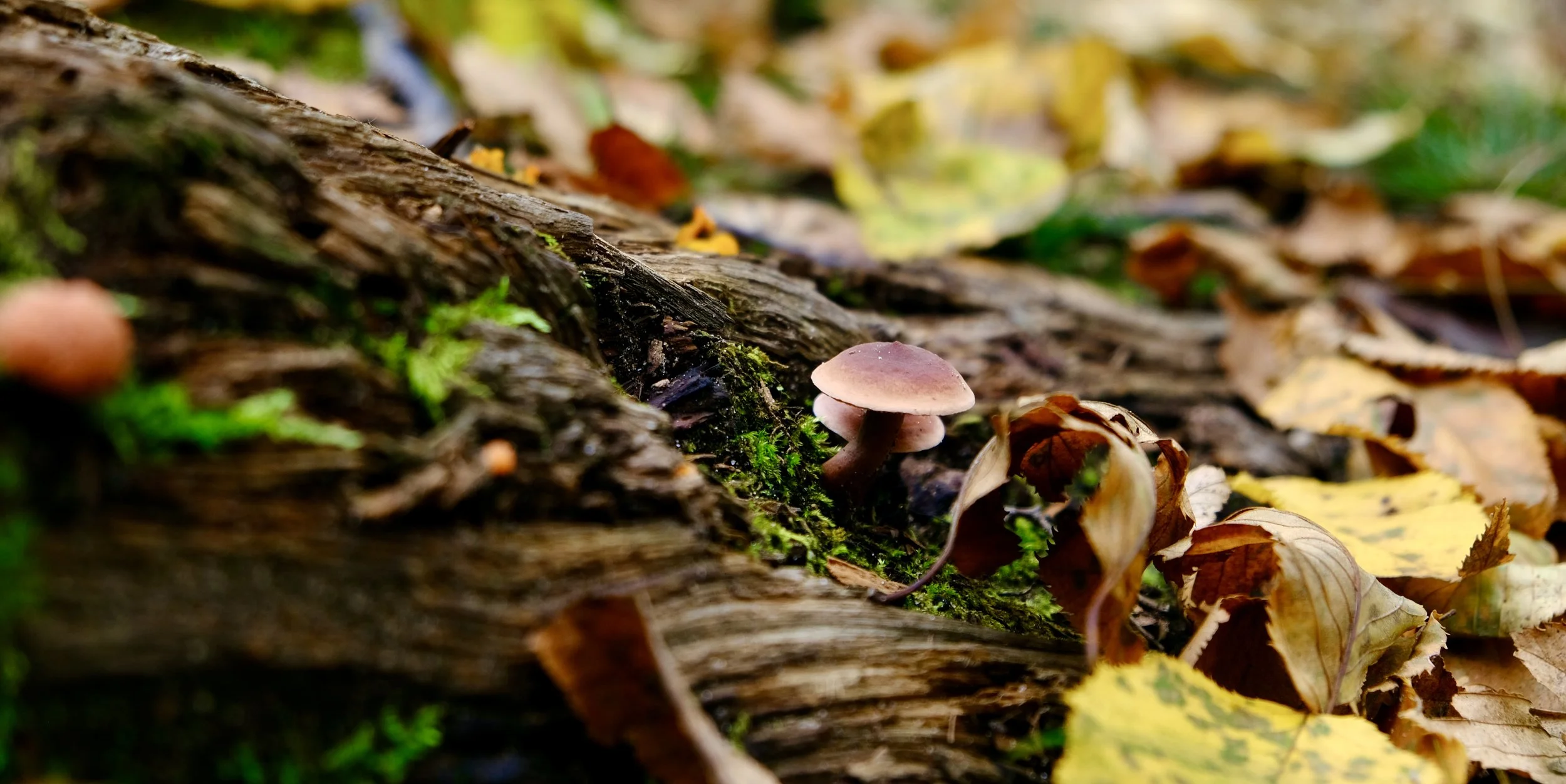A small mushroom growing on a fallen log surrounded by fallen autumn leaves and moss.