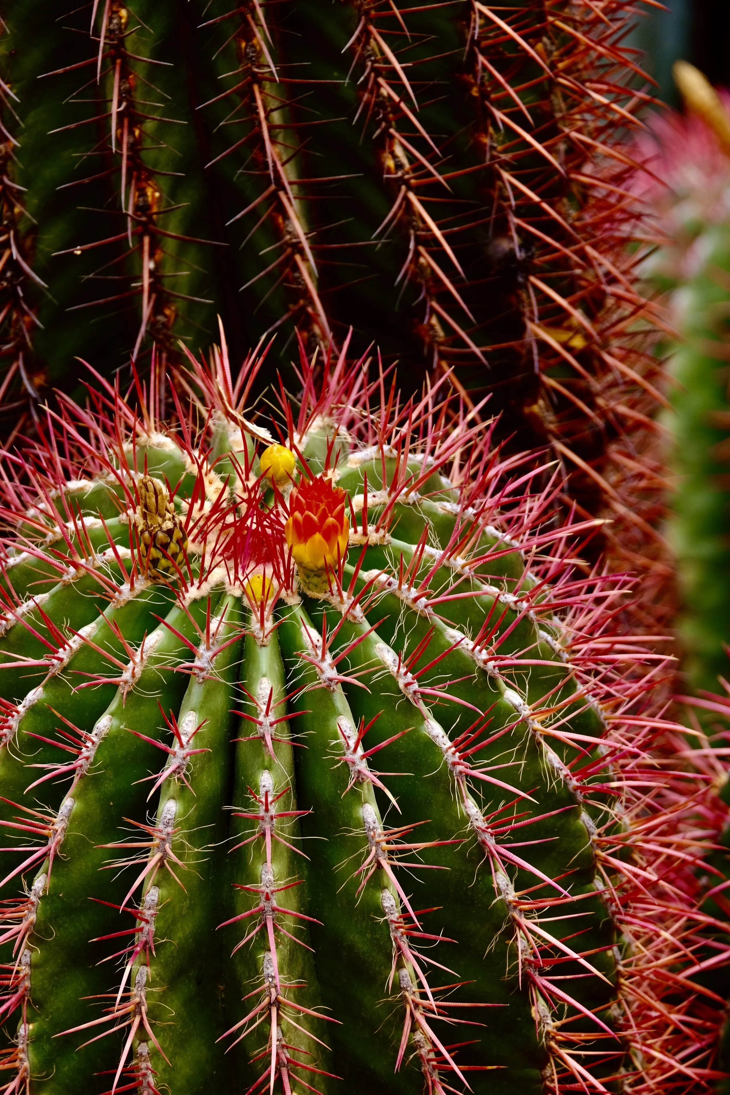 Close-up of a round cactus with long, sharp, red spines and yellow flowers blooming from top, with a tall, columnar cactus with similar spines in the background.