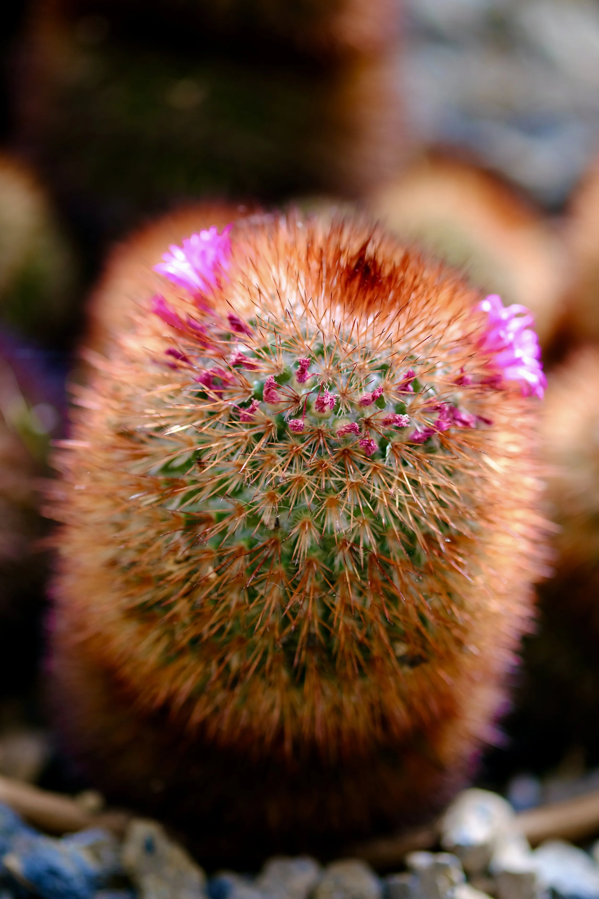 Close-up of a round cactus with pink flowers and spines, with a blurred background.