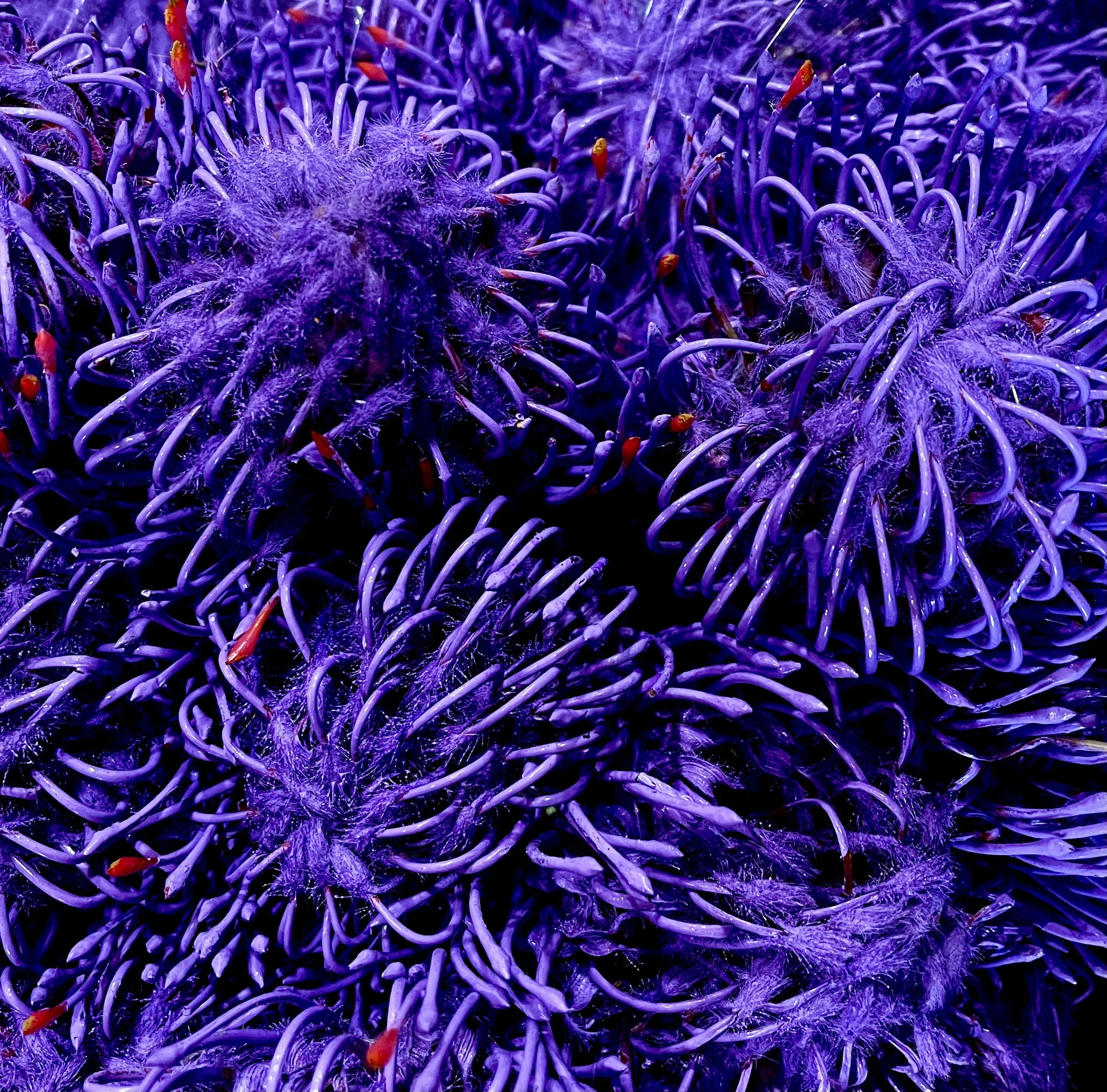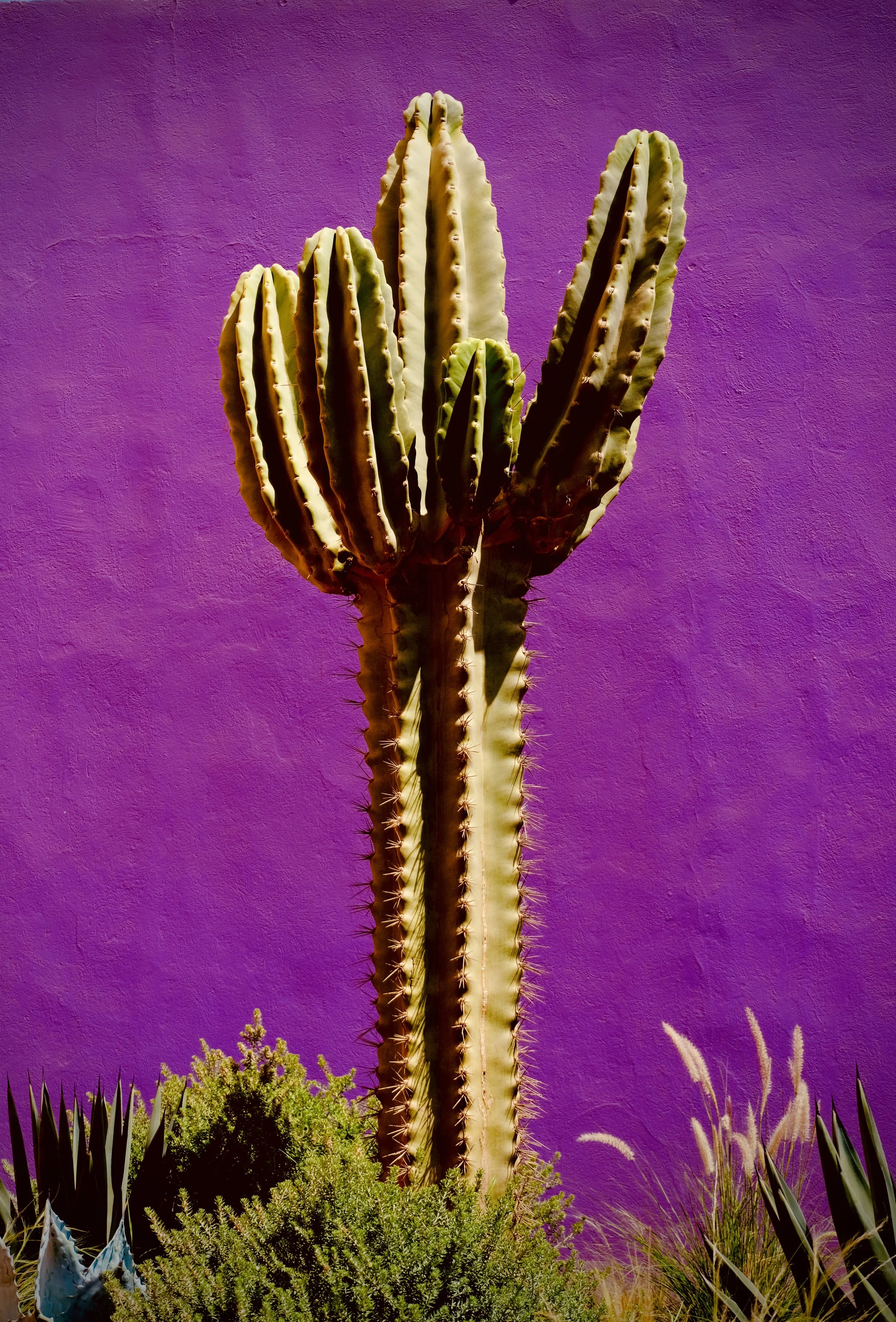 A tall saguaro cactus with multiple arms against a vibrant purple background, surrounded by desert plants.