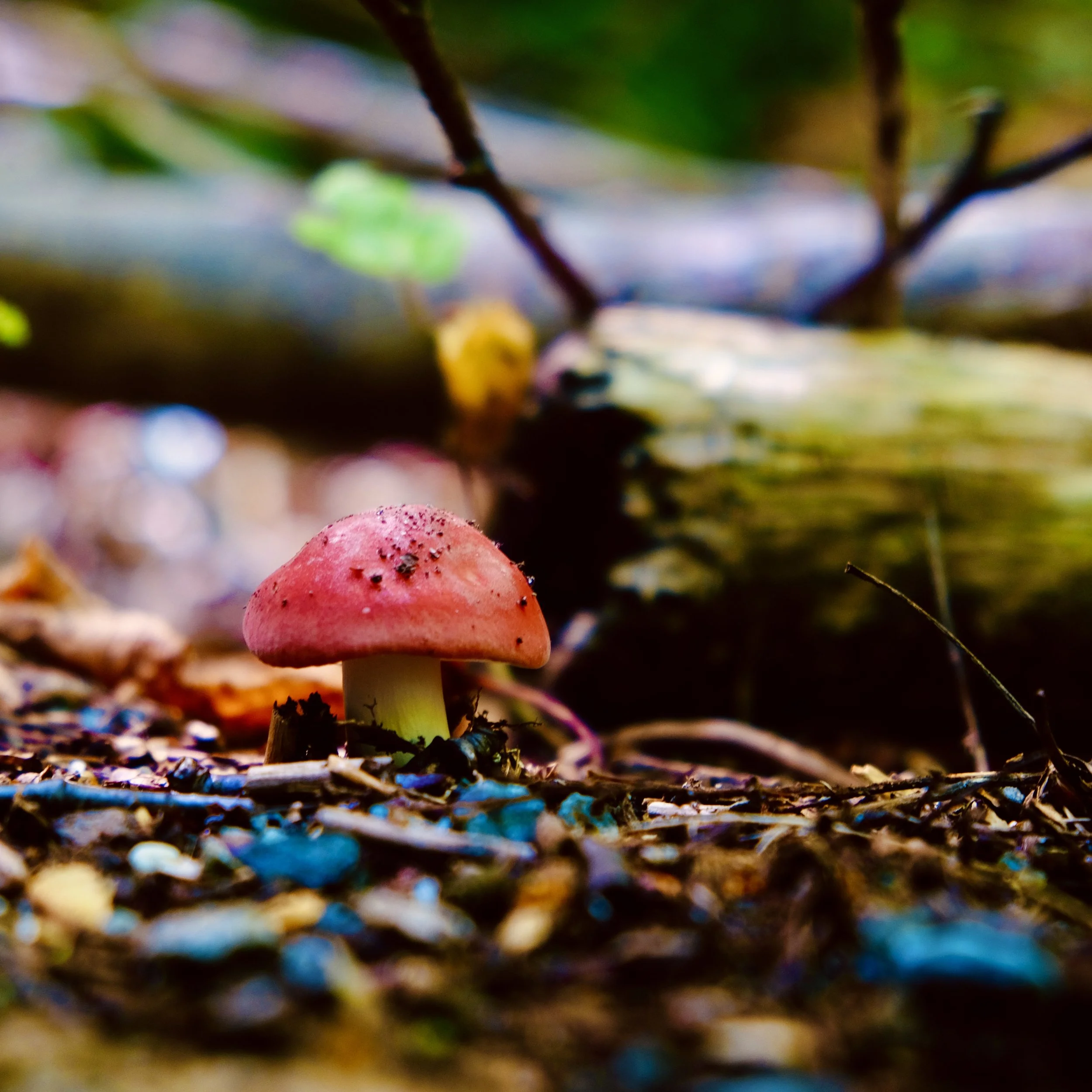 Close-up of a small pink mushroom growing on forest floor with leaves, twigs, and soil around it