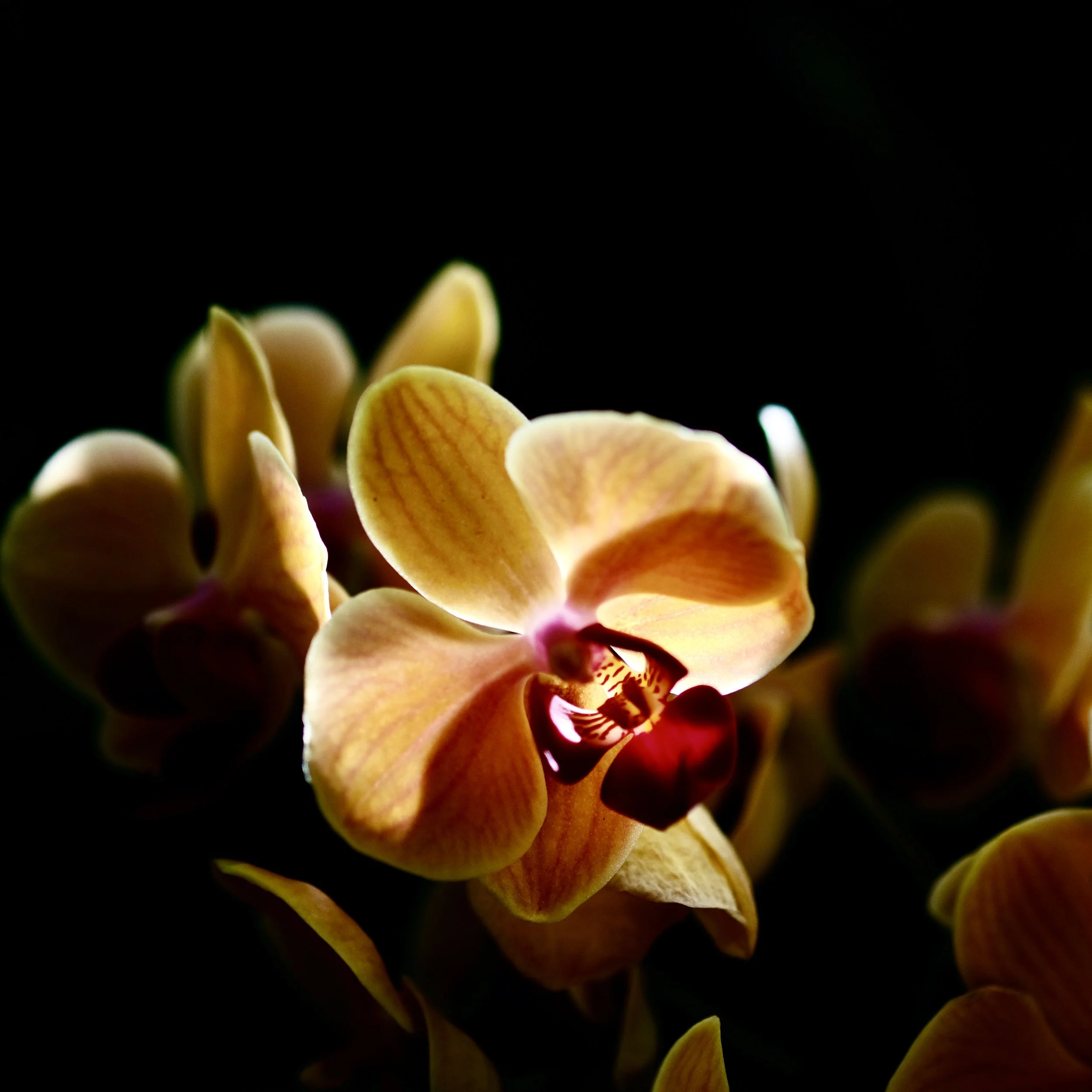 Close-up of a yellow and pink orchid flower with red accents against a black background.