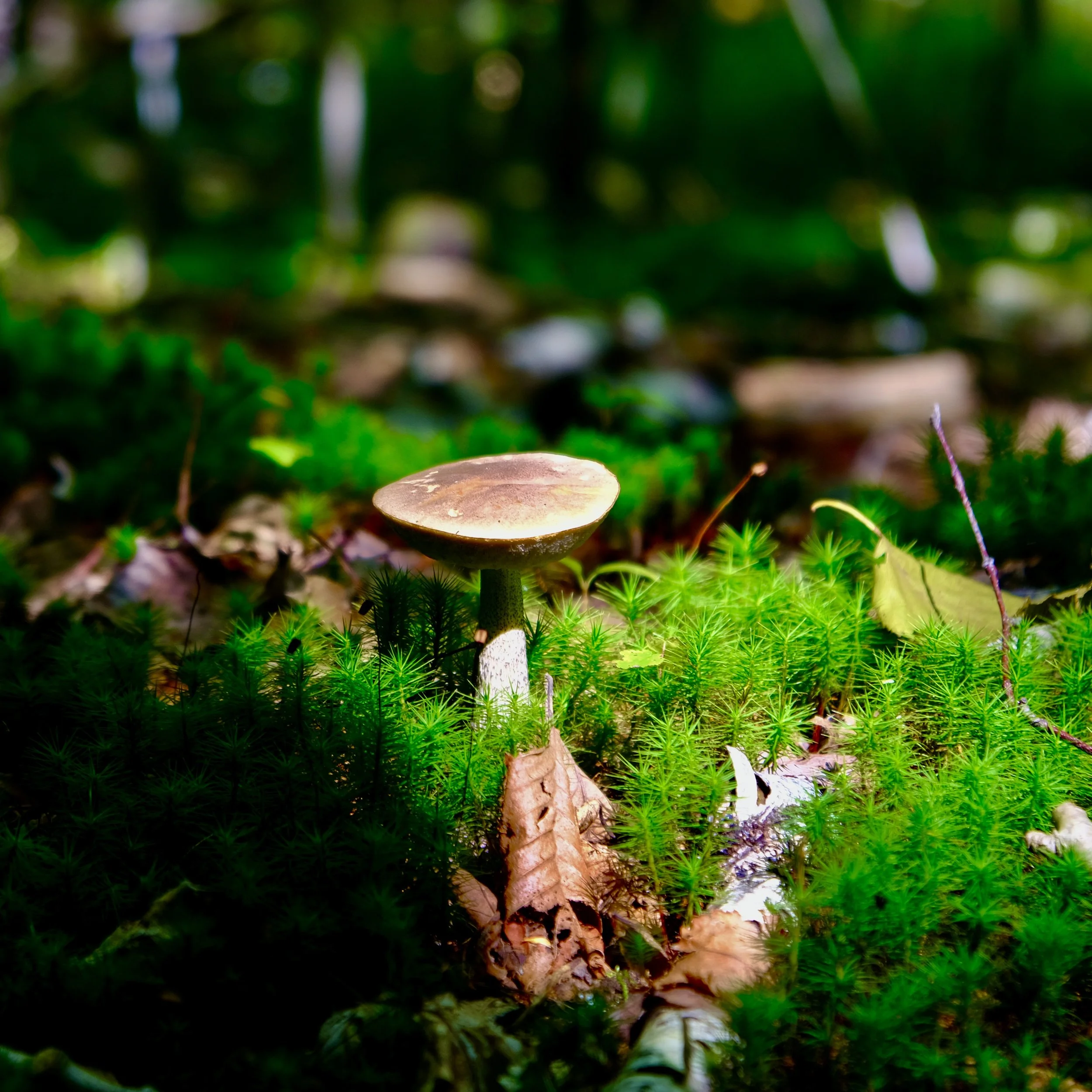 A single mushroom growing amidst green moss and fallen leaves on a forest floor.