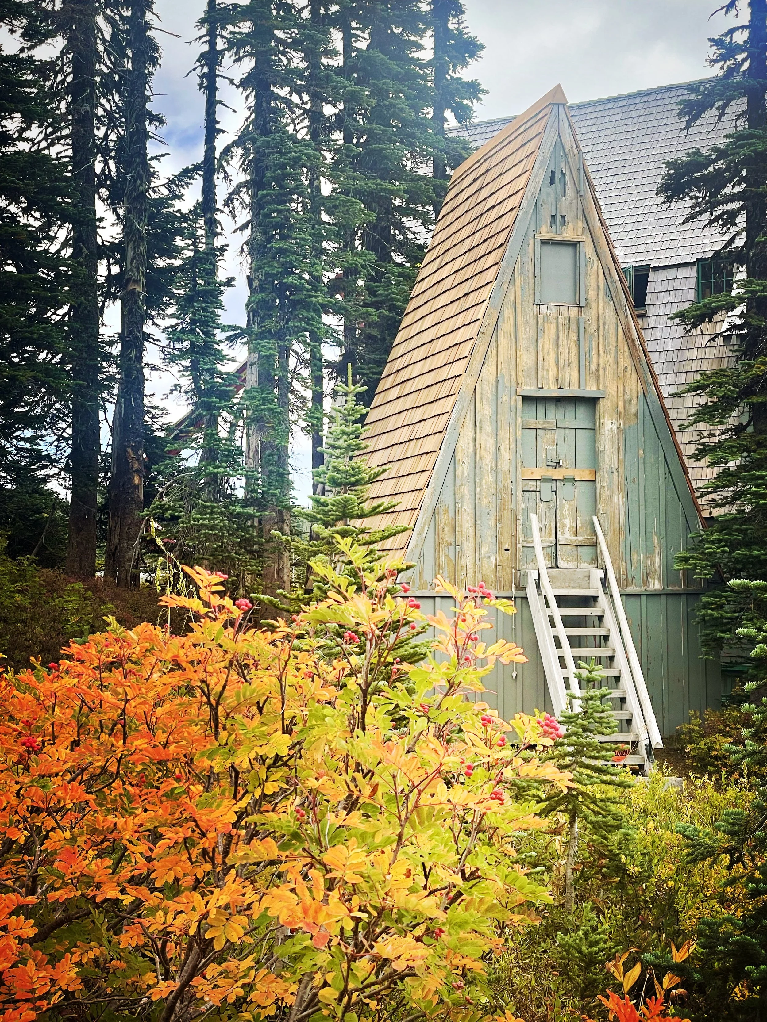 An A-frame wooden house surrounded by tall trees and colorful autumn foliage.