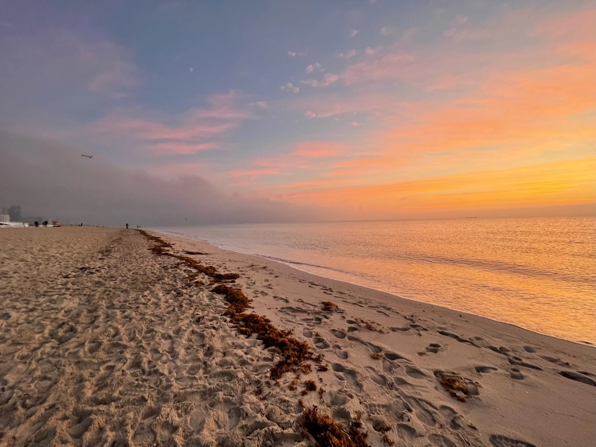 Sunset over a sandy beach with ocean, footprints, and seaweed, with a few distant people and an airplane flying in the sky.
