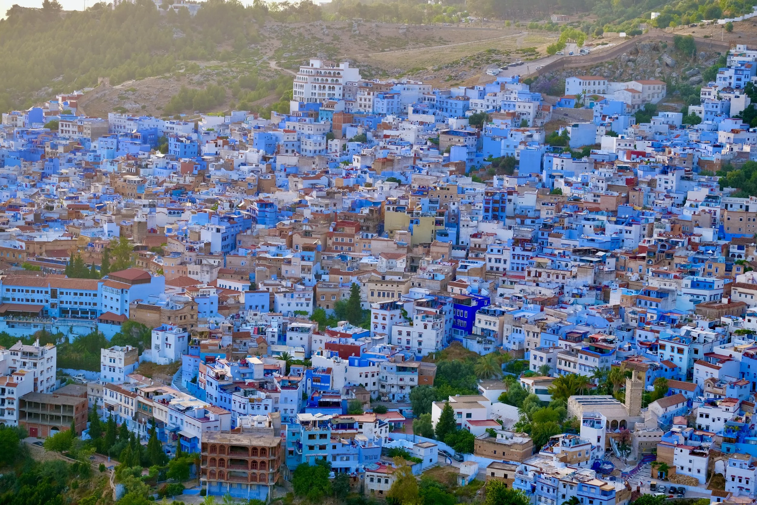 A hillside cityscape with numerous white and blue buildings under a clear sky. Chefchaouen is a city in northwest Morocco. It is the chief town of the province of the same name and is noted for its buildings in shades of blue, for which it is nicknam