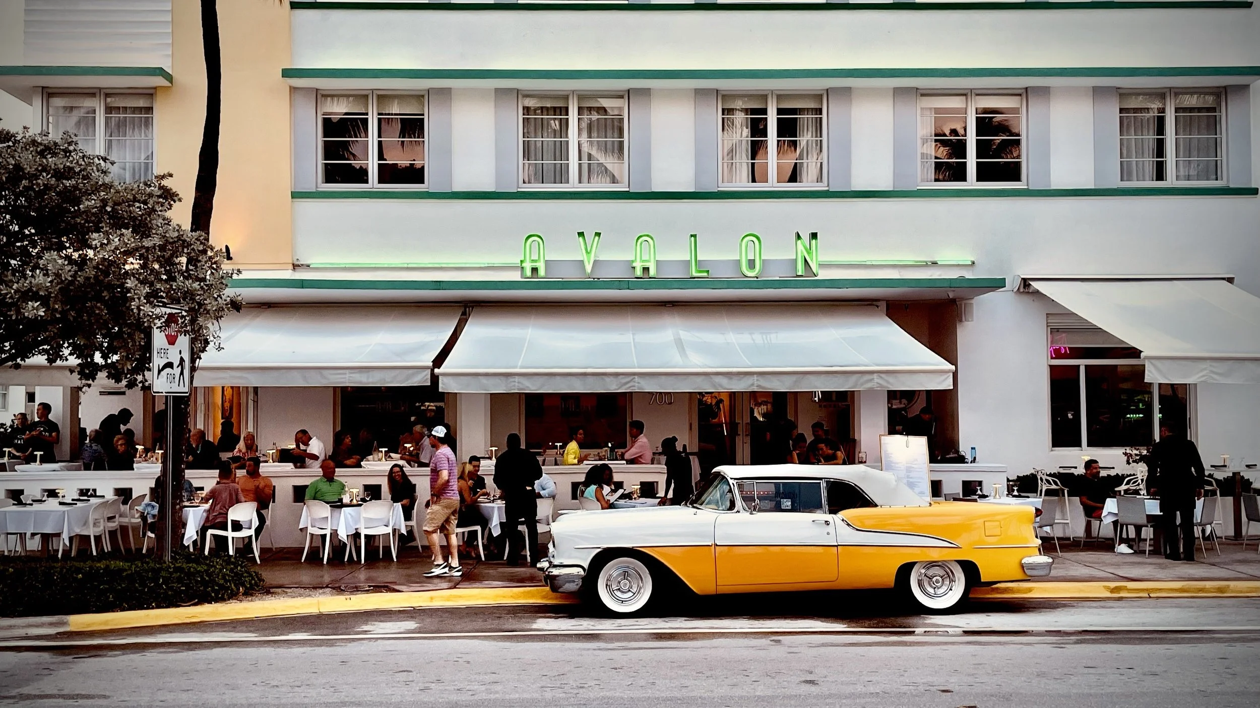 A vintage yellow and white car parked in front of a restaurant named Avalon with people dining outside and a building with neon green sign and multiple windows.