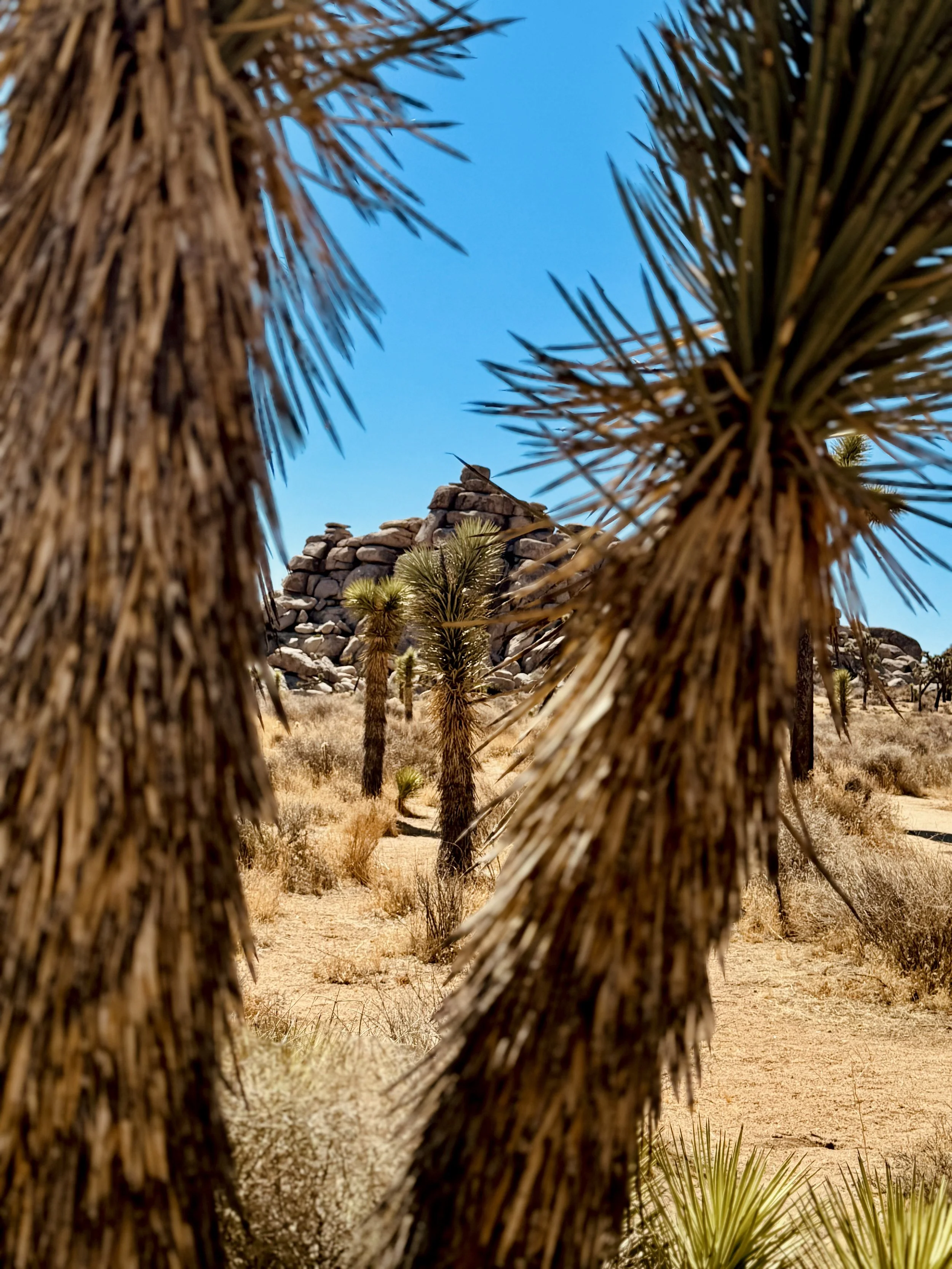 Desert landscape with Joshua trees, rocky formations, and a clear blue sky, viewed through the branches of a Joshua tree.