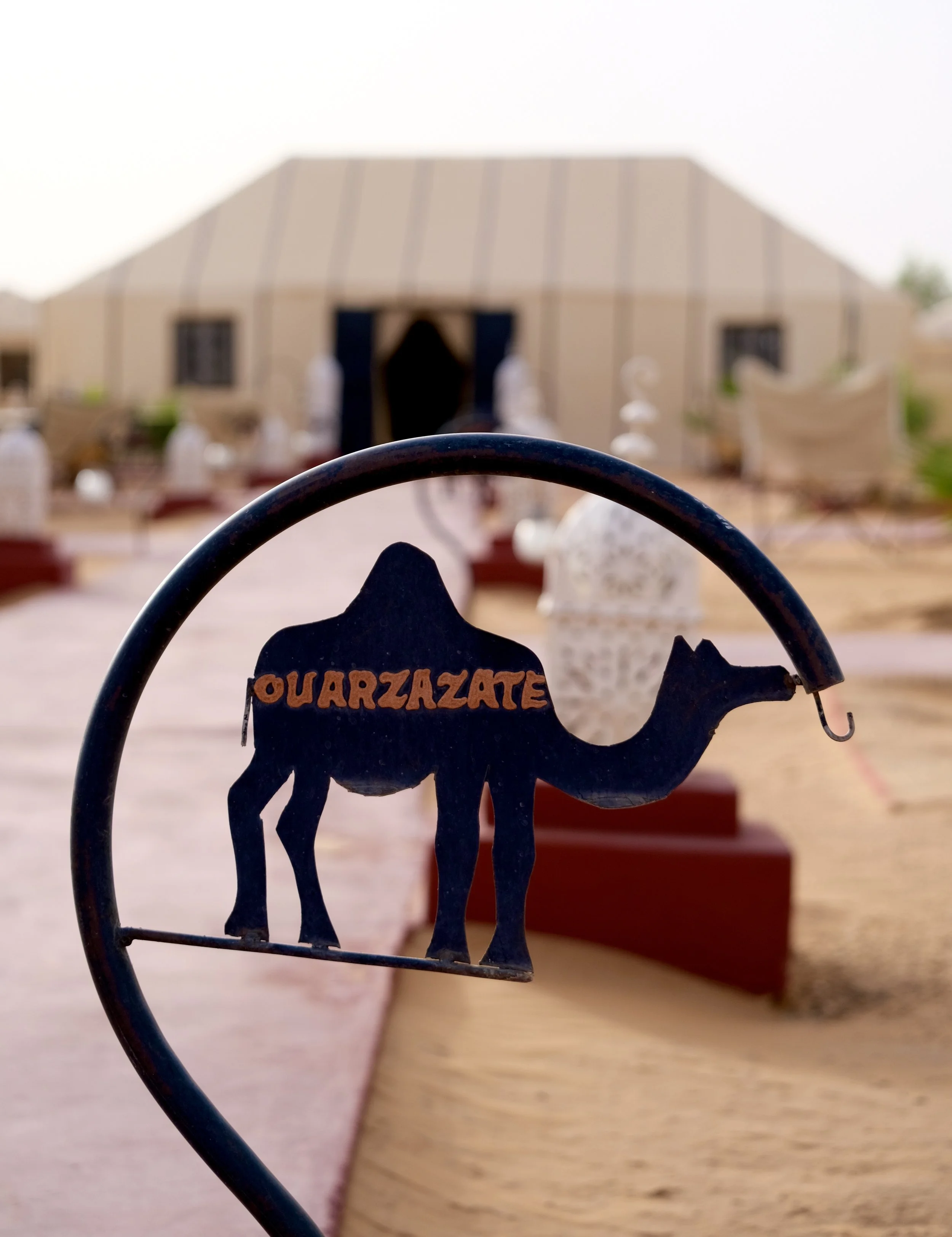 A decorative camel-shaped sign with the word "QUARZAZATE" in front of a tent-like structure with beige walls and dark blue curtains, outdoors in a desert setting.