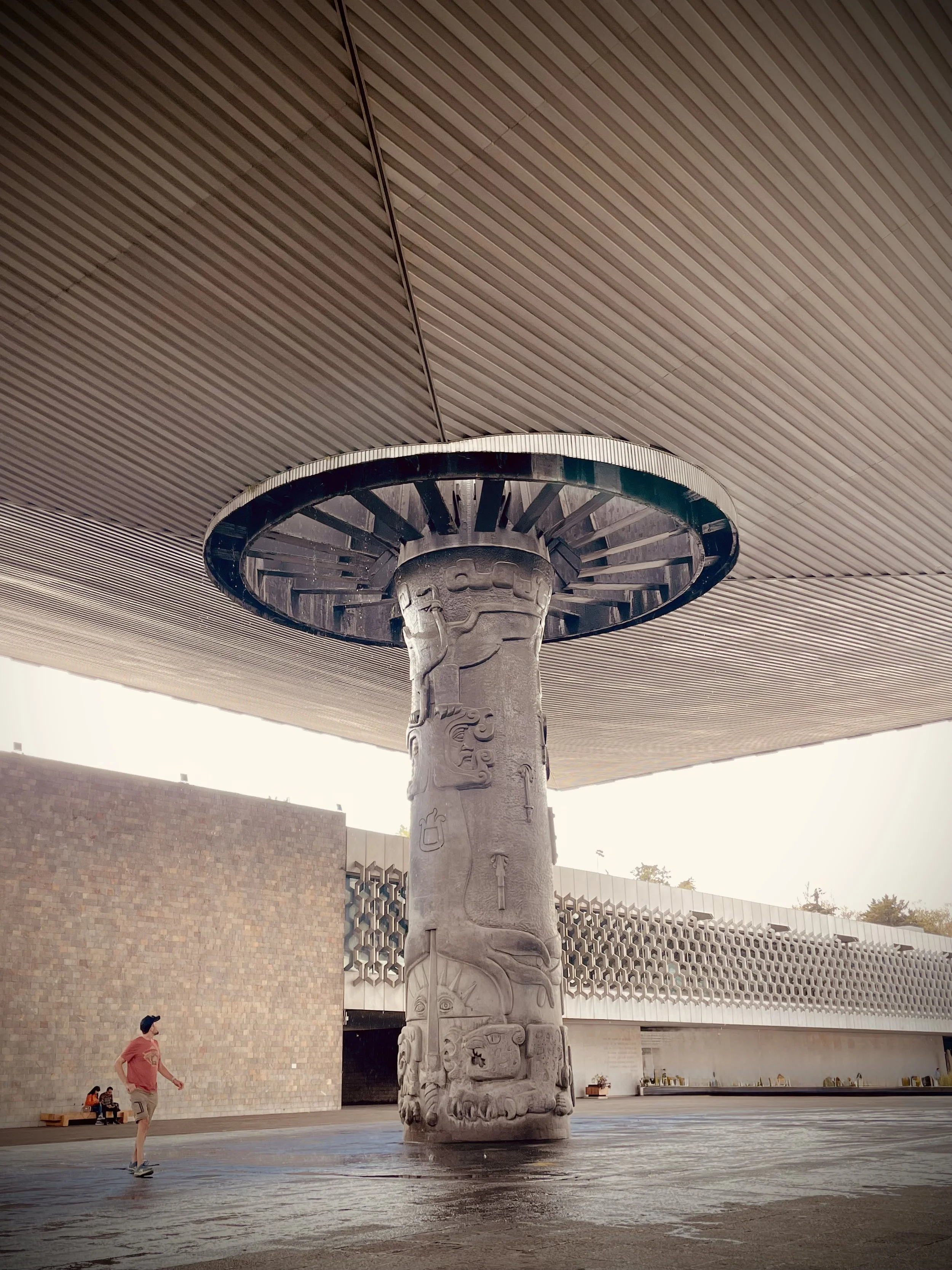 A large, ornate stone pillar with carvings supporting a circular roof structure in a modern architectural setting with a person walking nearby.