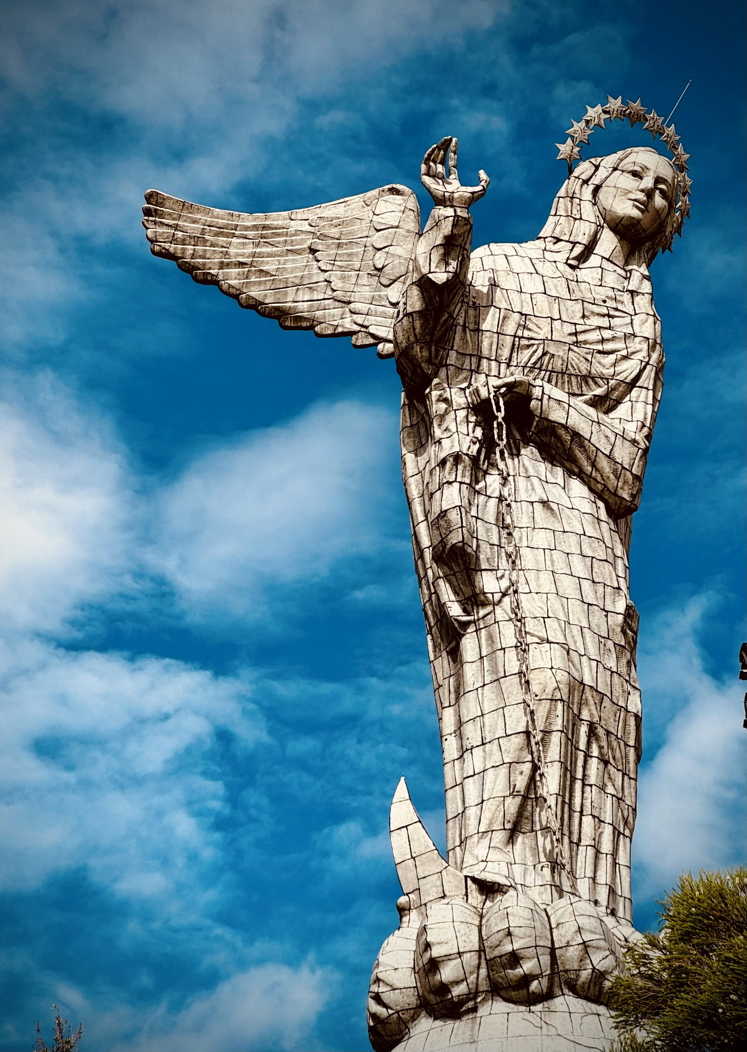Large wooden statue of an angel with a halo of stars, a wing, and a hand raised in blessing against a blue sky with clouds.