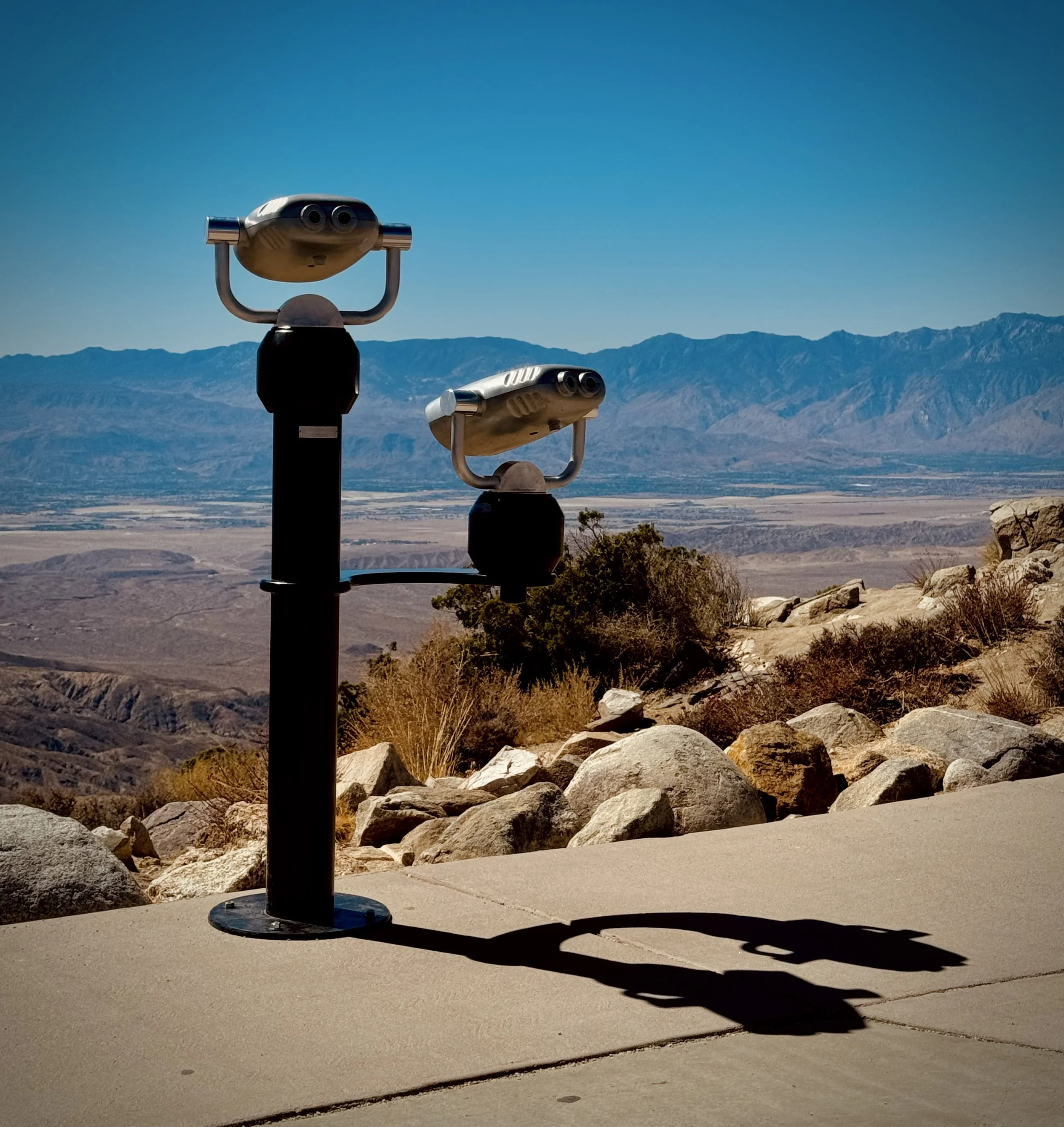 Two coin-operated binoculars on a sidewalk overlooking a desert landscape and mountain range.