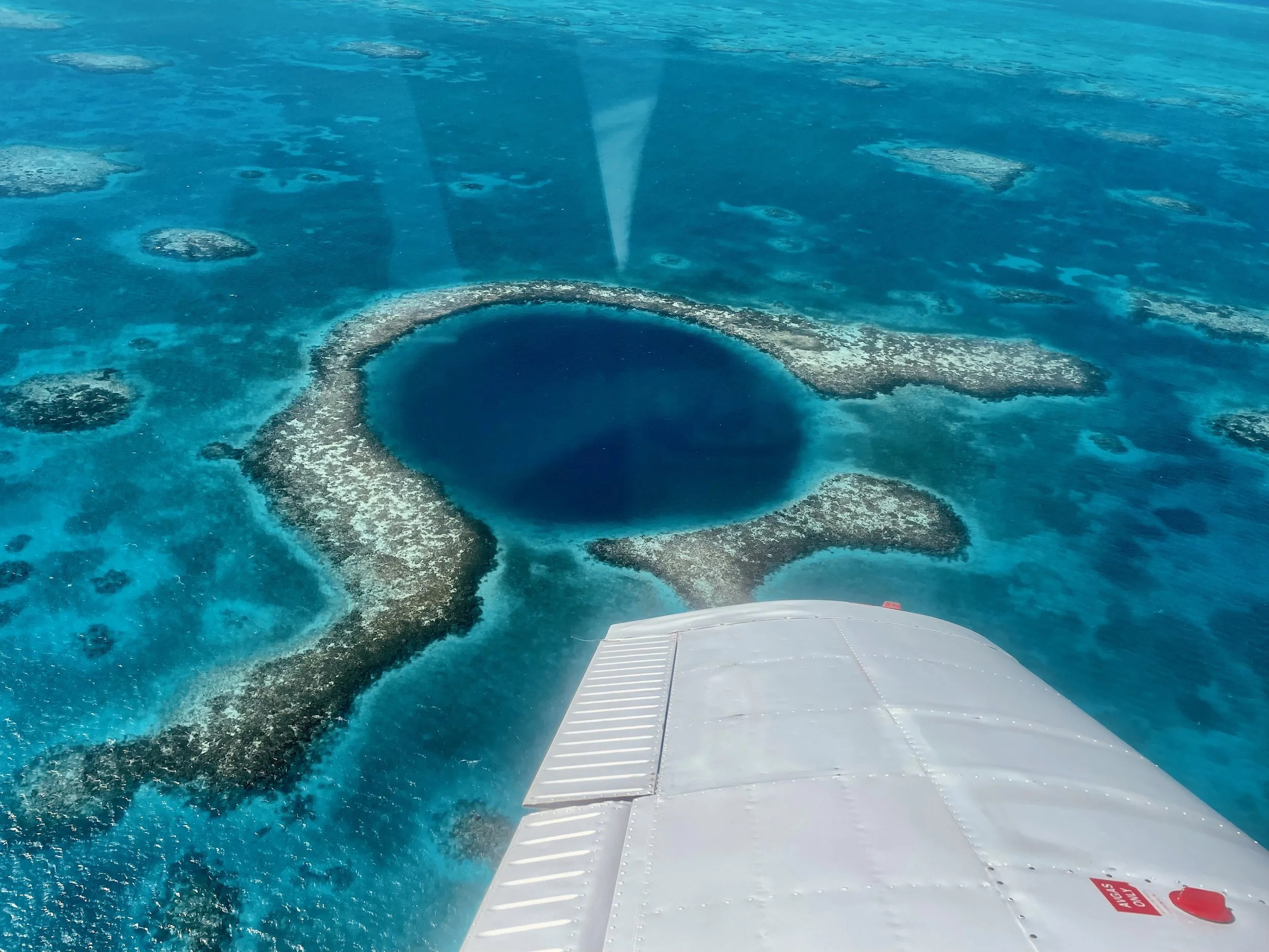 Aerial view from an airplane showing a large, circular blue hole, surrounded by coral reefs and turquoise water in the ocean. Great Blue Hole is a large marine sinkhole off the coast of Belize.