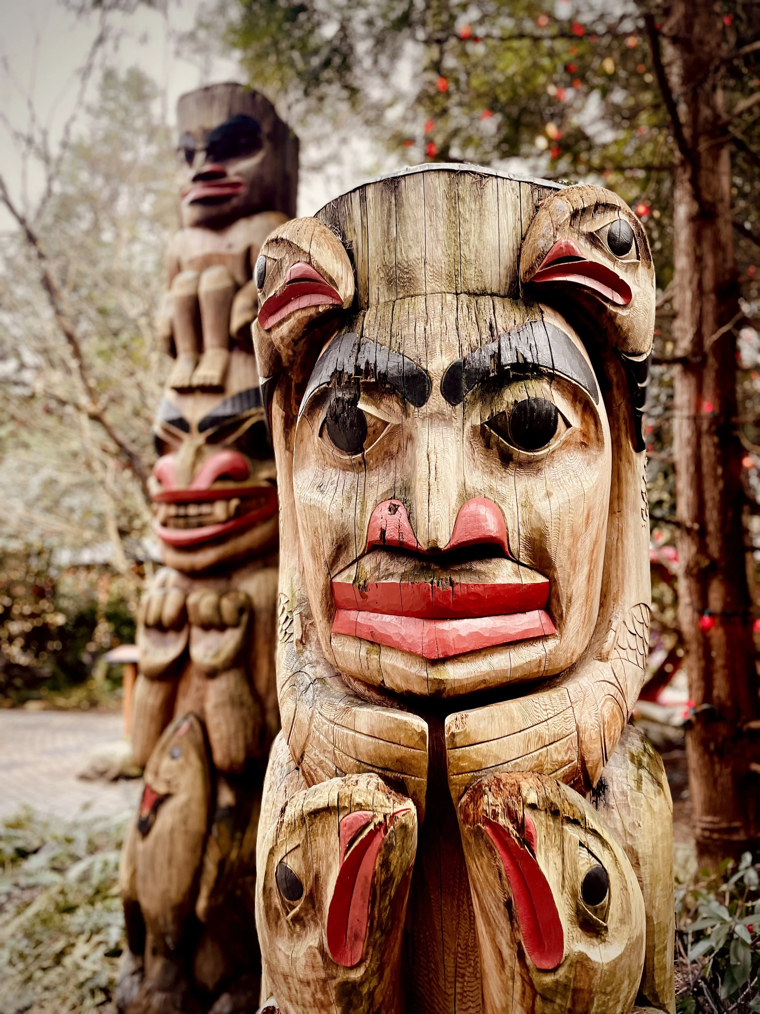 Colorful carved wooden totem poles with human, animal, and mythological figures outdoors.