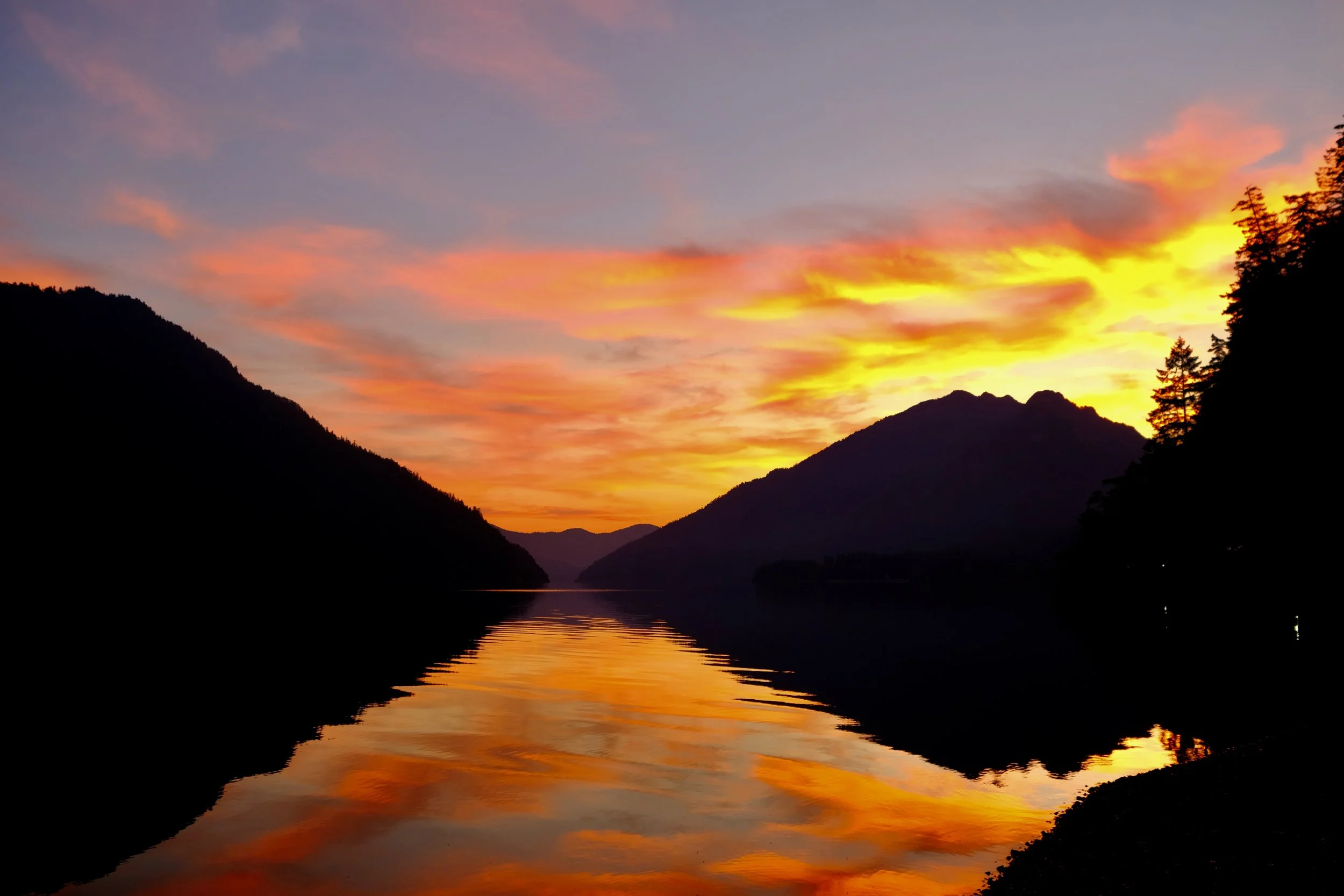 Sunset over a river surrounded by mountains with colorful sky and reflected water.