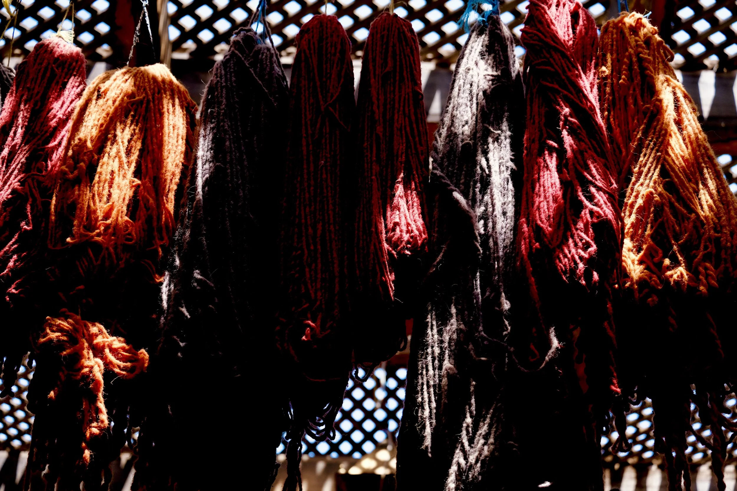 Colorful yarns hanging on a line outside with a wooden lattice background.