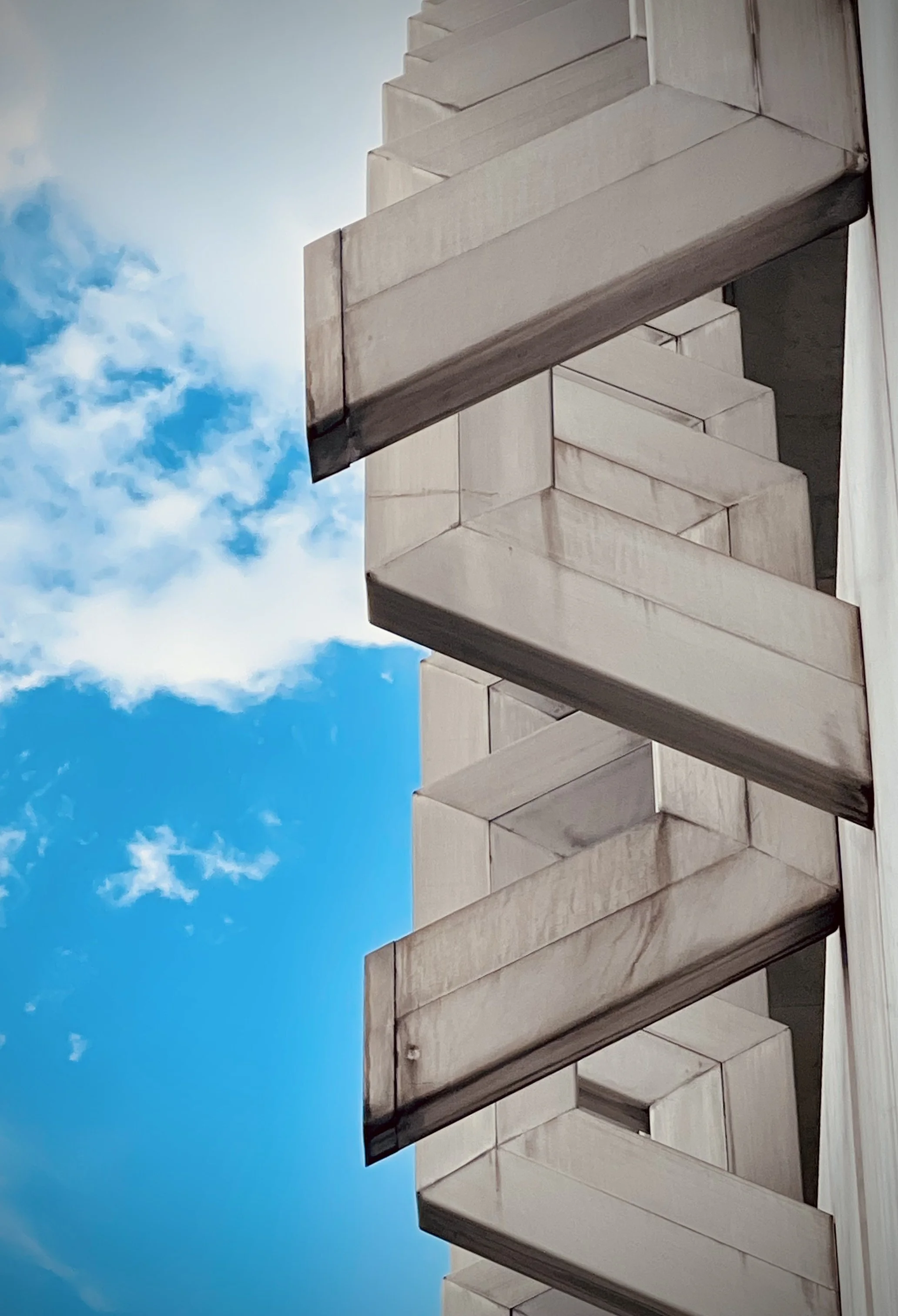 Close-up of a modern building's exterior featuring a series of angular, protruding balconies made of light-colored concrete against a background of a partly cloudy blue sky.