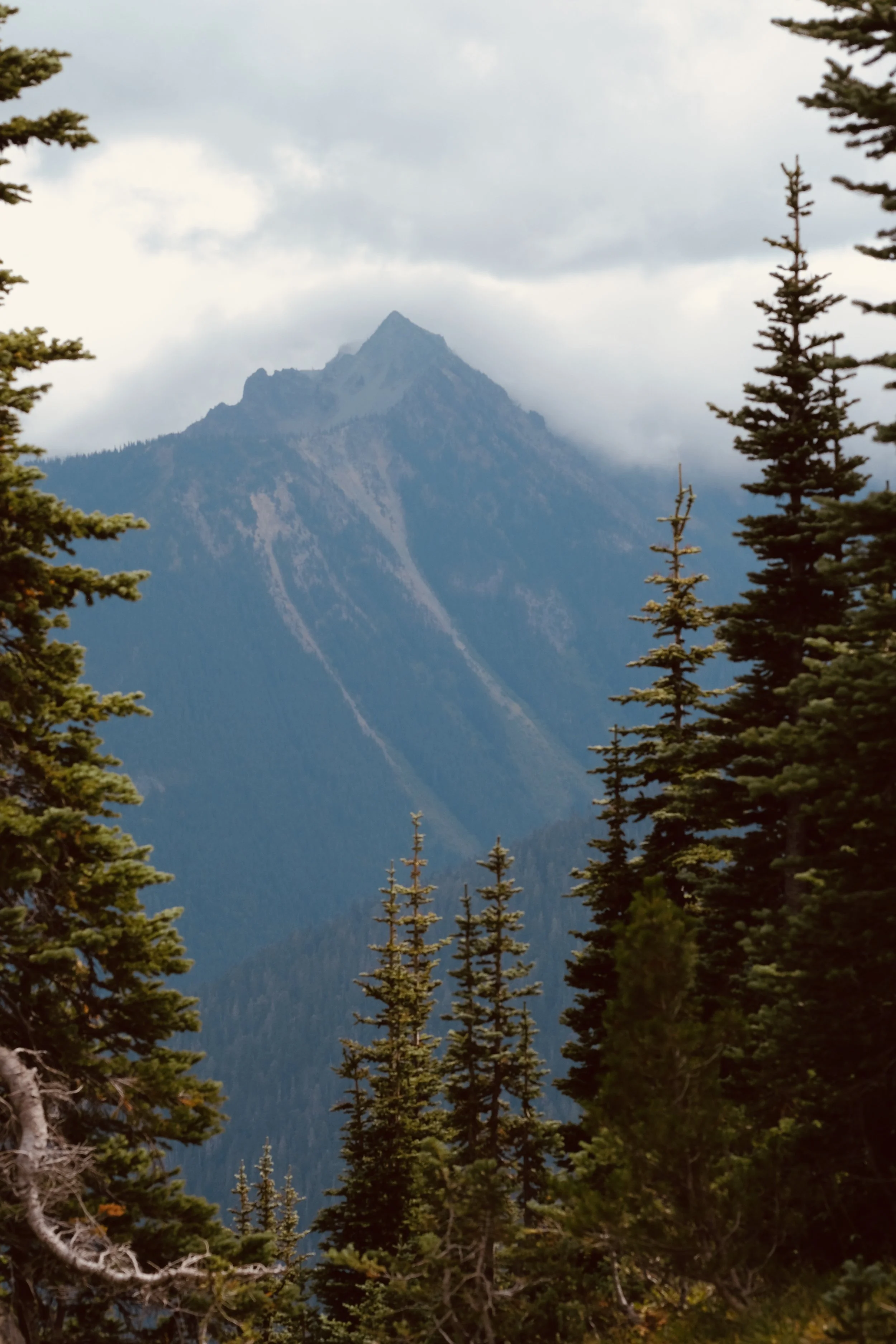 View of a mountainous landscape with a prominent mountain peak in the background, surrounded by pine trees in the foreground and partly cloudy sky.