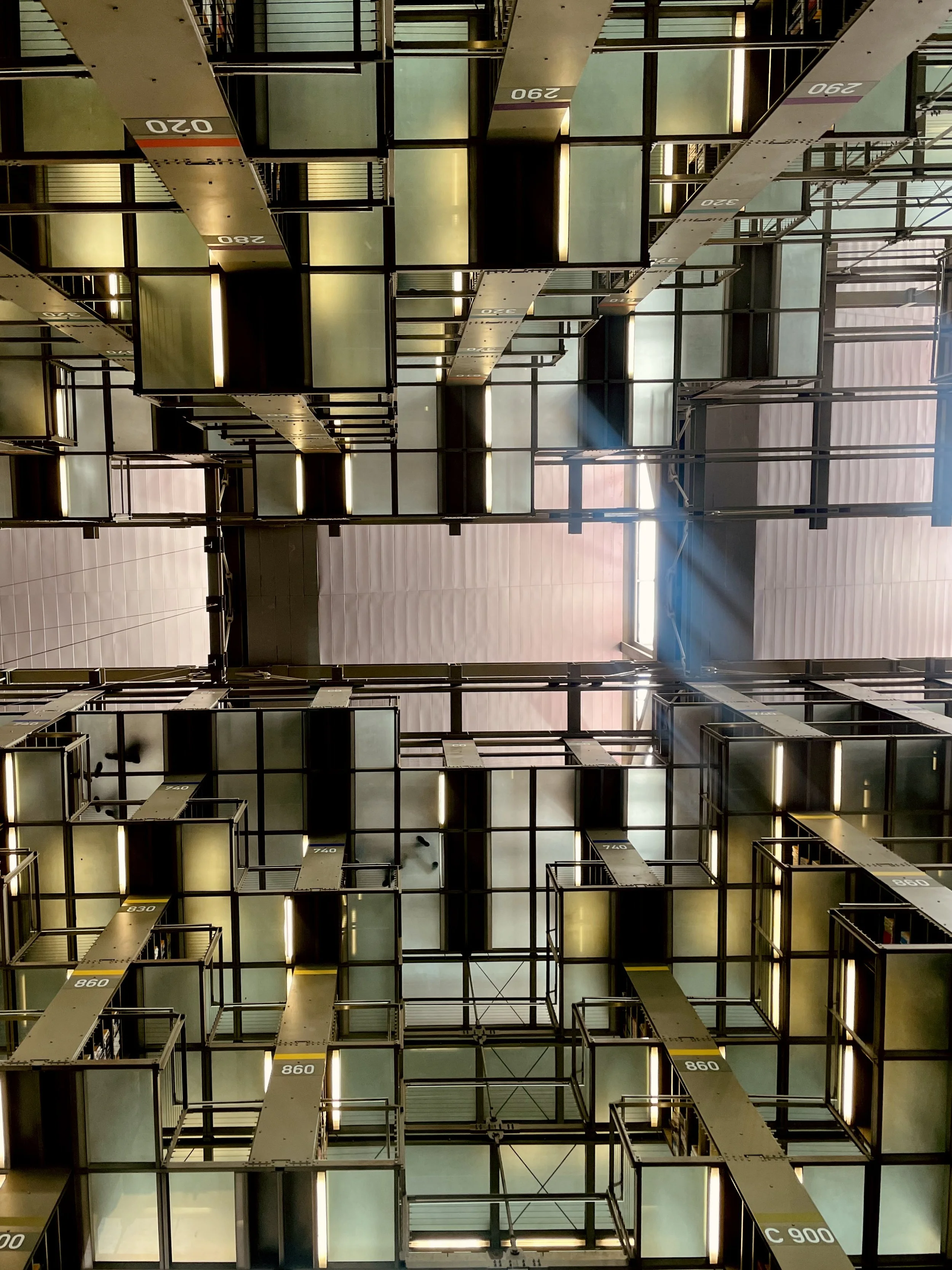 Interior view of a modern multi-level building with open corridors, glass walls, and illuminated walkways, seen from below.